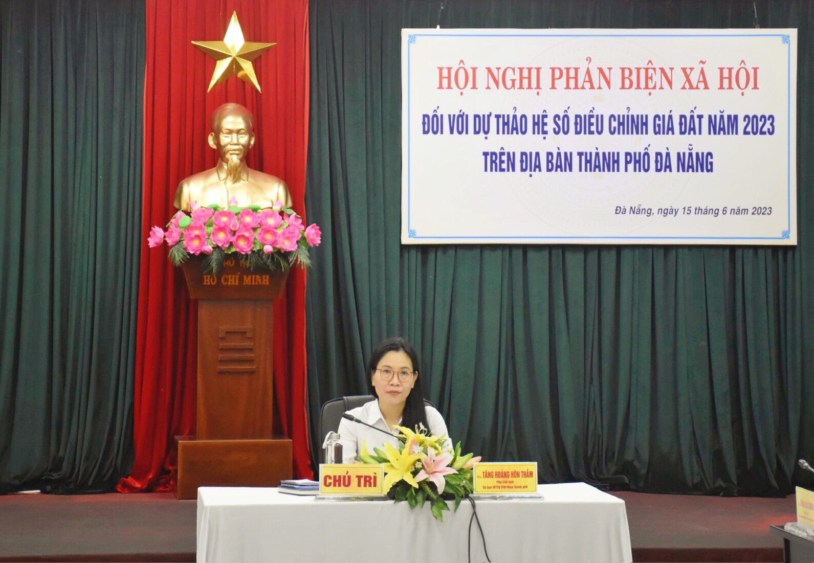 Sáng ngày 15/6, Ban Thường trực Ủy ban MTTQ Việt Nam thành phố Đà Nẵng tổ chức Hội nghị phản biện xã hội đối với dự thảo Hệ số điều chỉnh giá đất năm 2023 trên địa bàn thành phố bằng hình thức đối thoại trực tiếp với Sở Tài chính thành phố, cơ quan chủ trì dự thảo văn bản. Bà Tăng Hoàng Hôn Thắm, Phó Chủ tịch Ủy ban MTTQ Việt Nam thành phố chủ trì hội nghị.