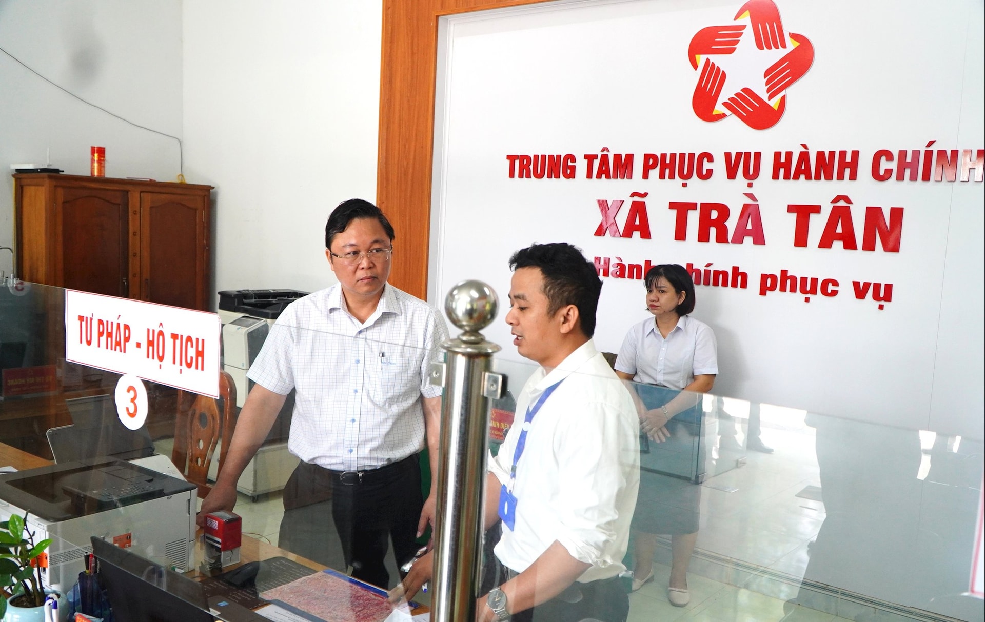 Phó Chủ tịch Ủy ban MTTQ Việt Nam thành phố Nguyễn Phi Hùng (đứng giữa) trao đổi với bà Trần Thị Hòa tại Trung tâm Phục vụ hành chính công xã Khâm Đức. Ảnh: VINH ANH