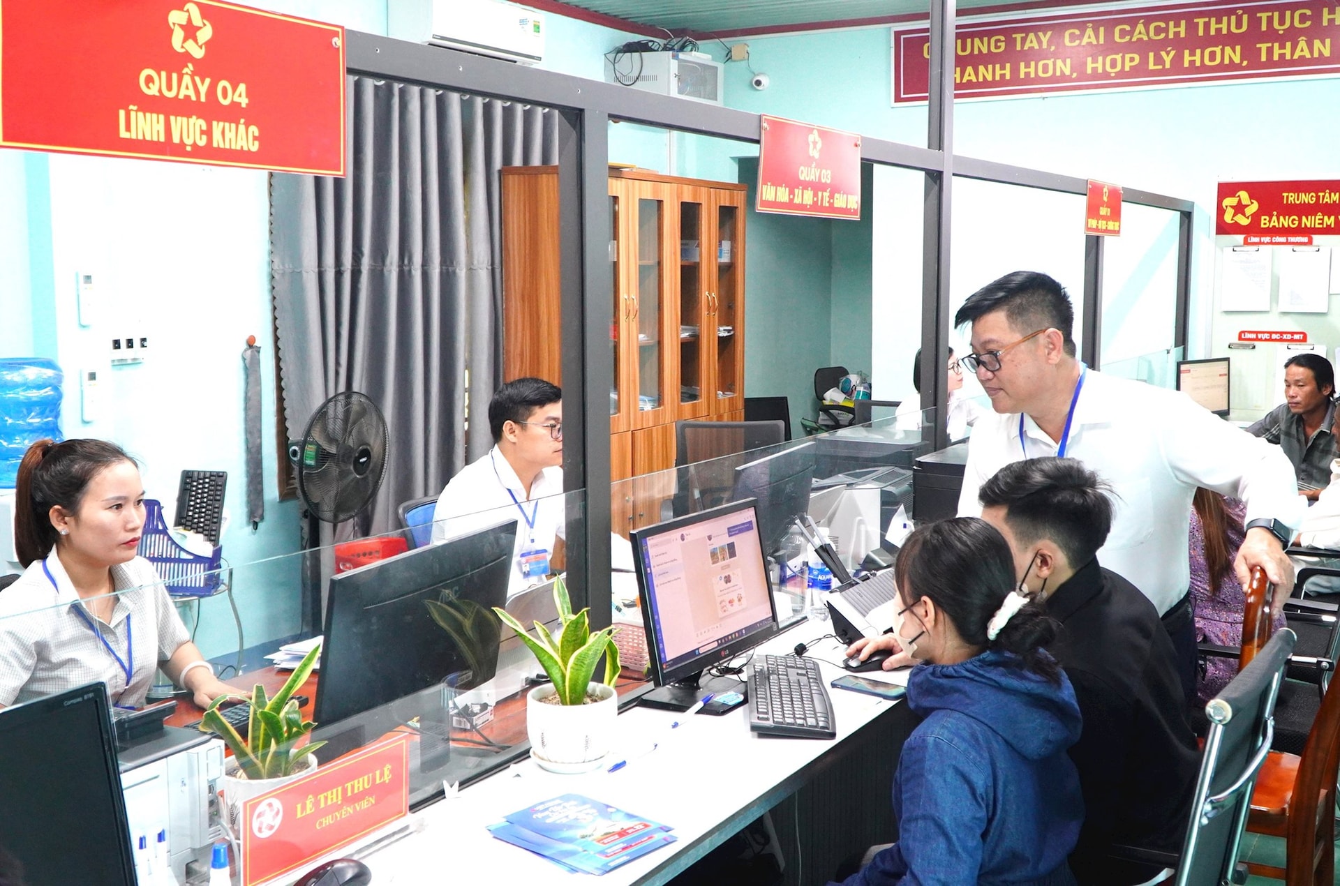 Ông Hồ Công Điểm, Chủ tịch UBND xã, cho biết, ngay từ đầu, dù kinh phí chưa có, xã đã chủ động sửa chữa Bộ phận Một cửa, trang bị điều hòa, bàn ghế nhằm tạo điều kiện tốt nhất cho cán bộ và người dân đến giao dịch. “Chúng tôi xác định đây là nơi phục vụ người dân, nên dù có phải vận dụng lại máy móc, trang thiết bị, hay cán bộ phải vượt qua điều kiện làm việc khó khăn. Công tác phối hợp giữa Trung tâm Phục vụ hành chính công và các ngành được thực hiện thường xuyên. Chúng tôi theo dõi, nhắc việc để đảm bảo các ngành giải quyết hồ sơ cho công dân nhanh nhất”, ông Điểm nói.