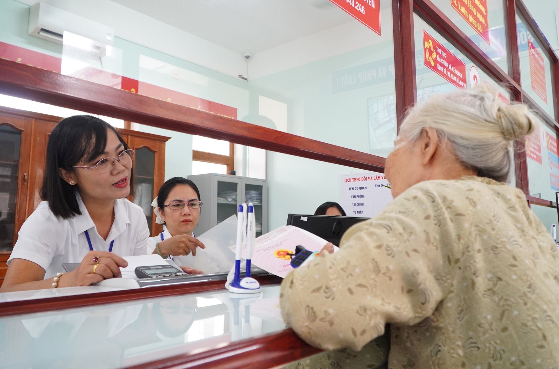 Bà Trần Thị Hòa được công chức Trung tâm Phục vụ hành chính công xã Khâm Đức hướng dẫn tận tình khi đến làm việc. Ảnh: VINH ANH