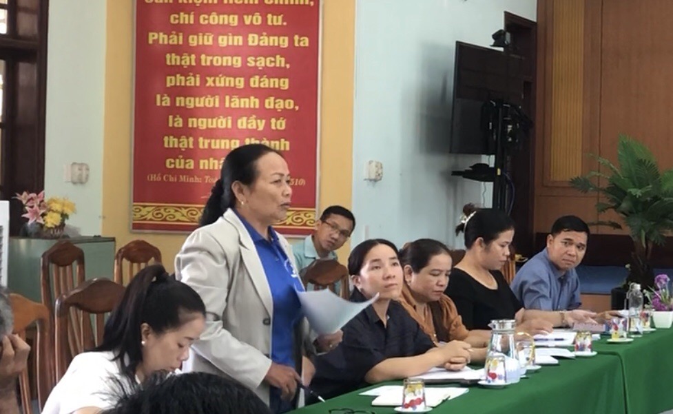Chị Đinh Thị Minh phát biểu trong một cuộc họp do thị trấn Khâm Đức tổ chức