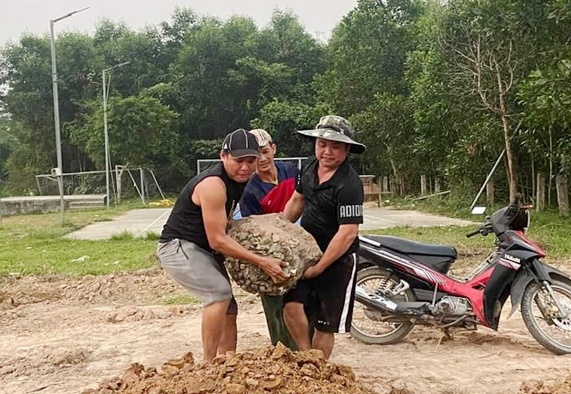 Anh Hoàng Tiến Phổ (nhìn vào bên phải) cùng các thành niên trong thôn tham gia xây dựng sân bóng