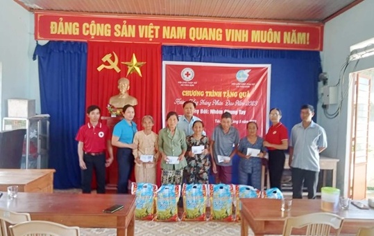 Anh Lê Anh Hùng cùng cán bộ địa phương trao quà cho các gia đình khó khăn