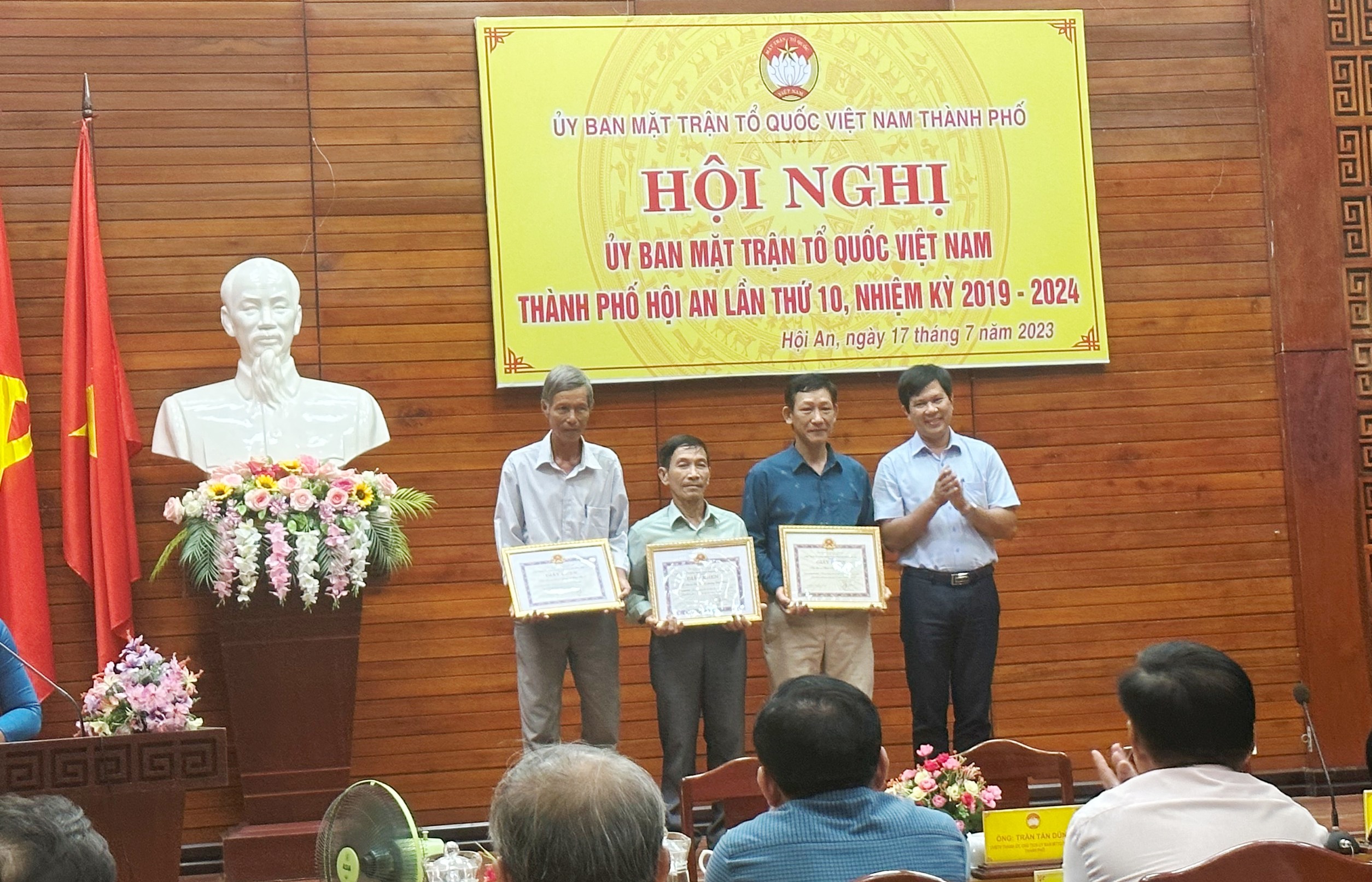 Ông Lê Trung Tài (áo xanh đậm) nhận khen thưởng tại Hội nghị lần thứ 10 Ủy ban MTTQ Việt Nam TP Hội An