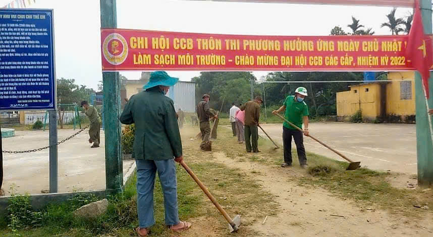 Chi hội Cựu chiến binh thôn Thi Phương dọn vệ sinh tại các điểm sinh hoạt cộng đồng.