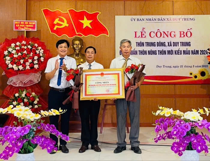 Tại buổi lễ, ông Đặng Hữu Phúc - Phó Chủ tịch UBND huyện Duy Xuyên trao bằng công nhận đạt chuẩn khu dân cư nông thôn mới kiểu mẫu năm 2024 cho thôn Trung Đông. Ngoài ra, UBND xã Duy Trung khen thưởng 1 tập thể và 1 cá nhân có thành tích xuất sắc trong xây dựng khu dân cư nông thôn mới kiểu mẫu...