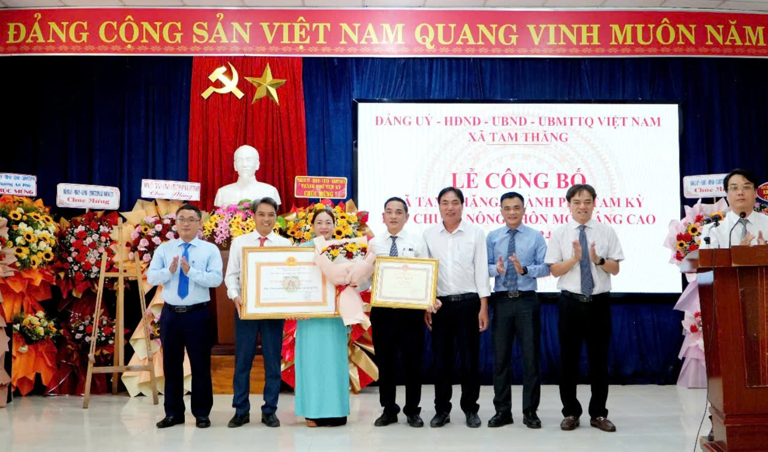 Tại Lễ công bố xã đạt chuẩn nông thôn mới nâng cao năm 2024, đại diện lãnh đạo thành phố đã trao Bằng công nhận của Chủ tịch UBND tỉnh Quảng Nam, đồng thời tặng hoa chúc mừng và biểu dương những nỗ lực vượt bậc của Đảng bộ, chính quyền và Nhân dân xã Tam Thăng. Lãnh đạo thành phố khẳng định, đây là kết quả kết tinh từ “ý Đảng, lòng dân”, là tiền đề quan trọng để địa phương tiếp tục hướng đến mục tiêu xây dựng đô thị văn minh – hiện đại trong giai đoạn mới.