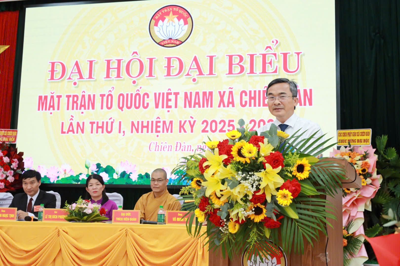 Phát biểu chỉ đạo tại Đại hội, đồng chí Nguyễn Phi Hùng – Phó Chủ tịch Ủy ban MTTQ Việt Nam thành phố Đà Nẵng ghi nhận và biểu dương những nỗ lực, kết quả mà Mặt trận xã Chiên Đàn đã đạt được trong thời gian qua. Đồng chí nhấn mạnh, để đạt mục tiêu phấn đấu đến năm 2030 đạt chuẩn nông thôn mới nâng cao, Đảng bộ, chính quyền xã cần tập trung tháo gỡ vướng mắc, hoàn thiện cụm công nghiệp, phát triển nông nghiệp hàng hóa, duy trì và nâng cao các tiêu chí nông thôn mới. Vì vậy, nhiệm vụ trọng tâm của MTTQ là phát huy vai trò nòng cốt, đổi mới phương thức hoạt động, tập hợp và đoàn kết các tầng lớp Nhân dân, khơi dậy truyền thống và khát vọng vươn lên, tạo sự đồng thuận xã hội.