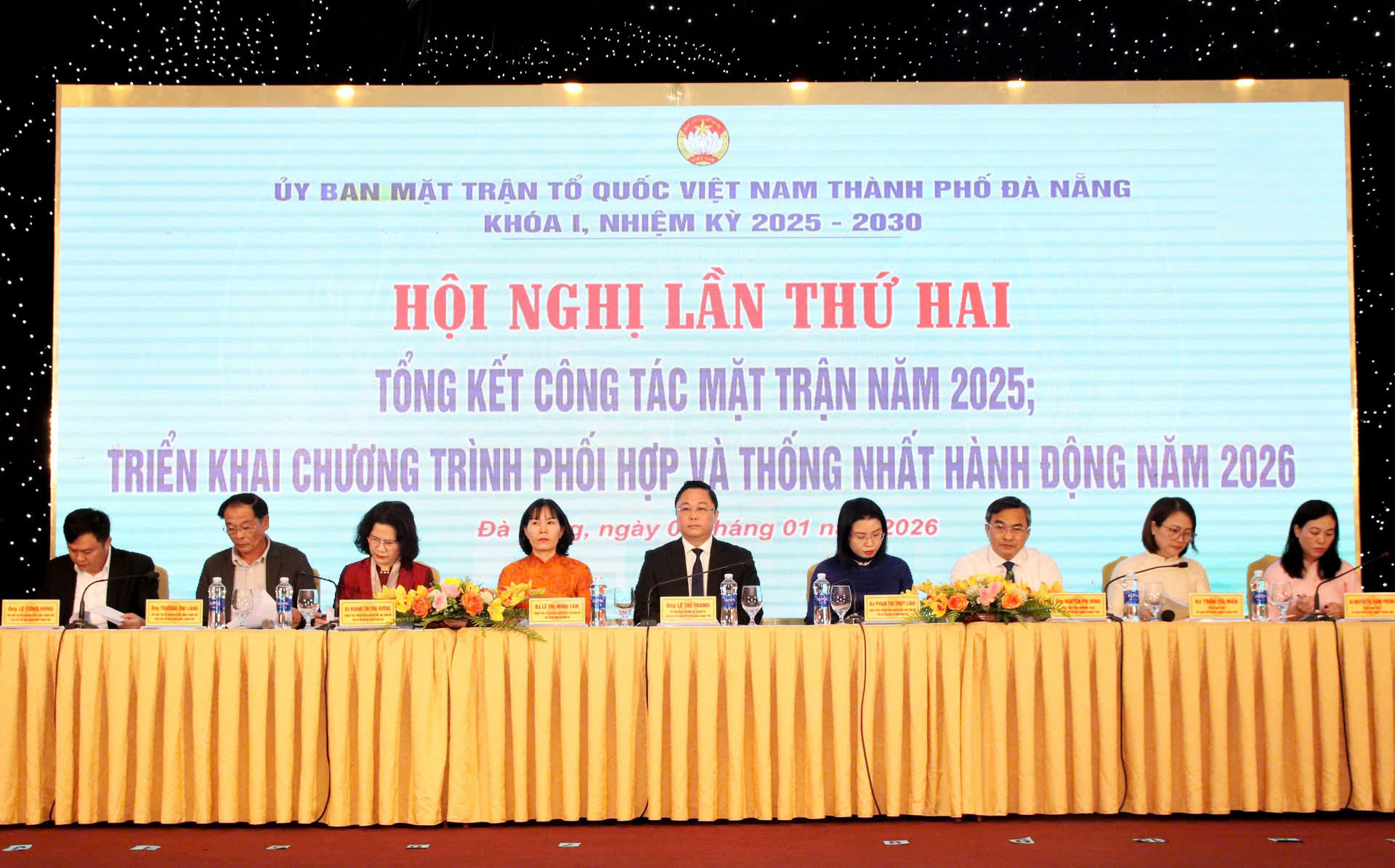 Chủ tịch Ủy ban MTTQ Việt Nam thành phố Lê Trí Thanh cùng các Phó Chủ tịch Ủy ban MTTQ chủ trì hội nghị. Tham dự có Phó Chủ tịch Thường trực UBND thành phố Hồ Kỳ Minh và Phó Chủ tịch HĐND thành phố Đoàn Ngọc Hùng Anh.