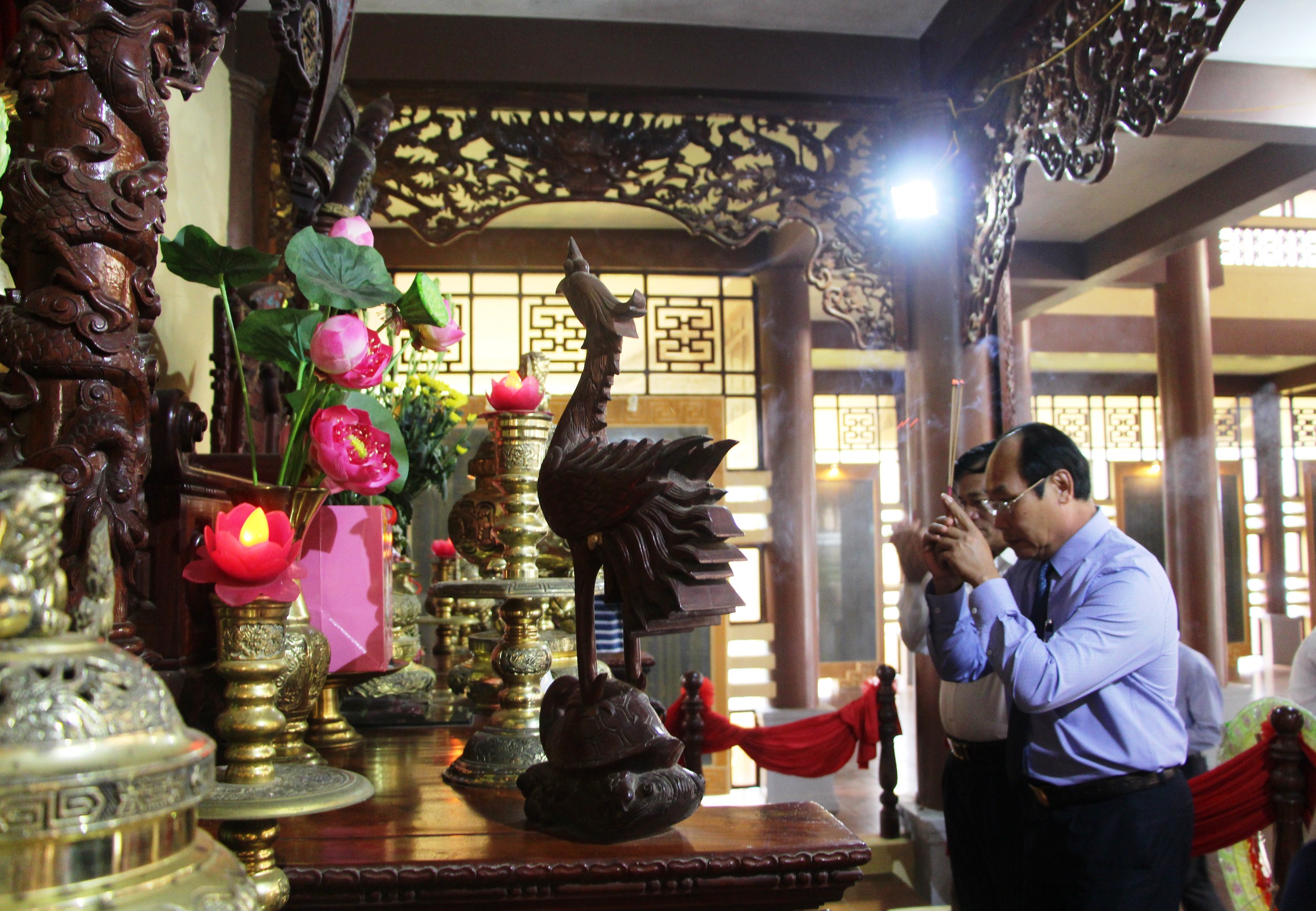 Phối hợp cùng đi với đoàn có lãnh đạo Sở Lao động - Thương binh và Xã hội tỉnh và lãnh đạo Huyện uỷ Quế Sơn. Trong buổi sáng, đoàn đã đến dâng hoa, dâng hương tưởng niệm các anh hùng liệt sỹ đã ngã xuống vì độc lập tự do của dân tộc tại Đền Liệt sỹ huyện Quế Sơn.
