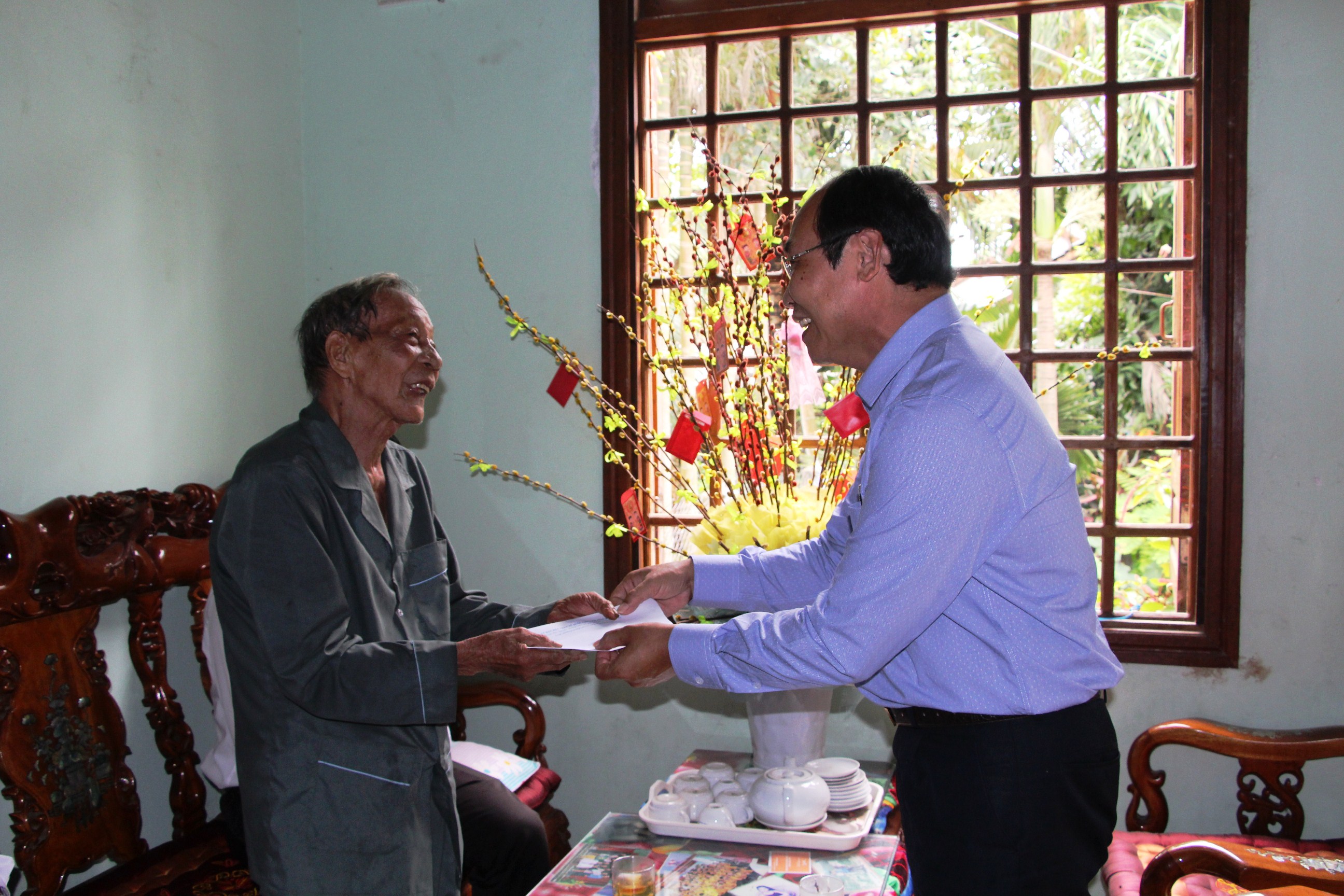 Ông Võ Xuân Ca, UVBTV Tỉnh uỷ - Chủ tịch UBMTTQVN tỉnh trao quà cho Bà Phạm Thị Liễng - Thương binh 2/4