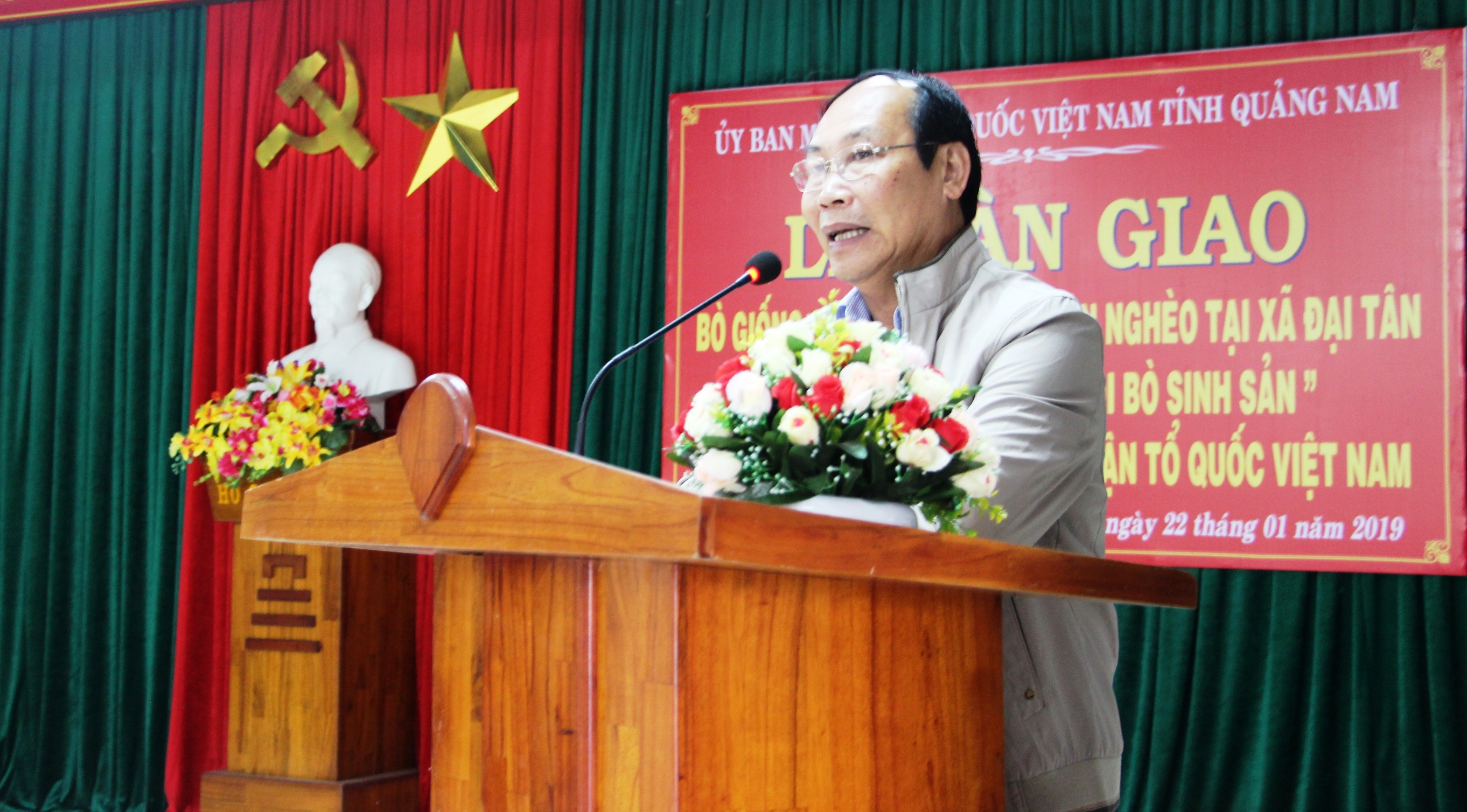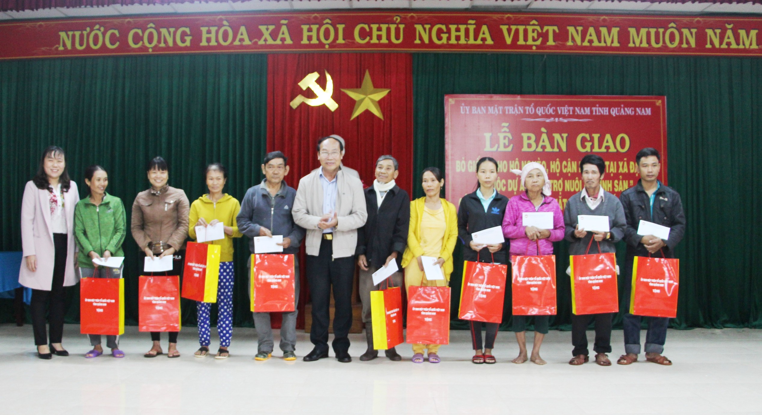 Đến trao bò cho bà con, ông Võ Xuân Ca - UVBTV, Chủ tịch Ủy ban MTTQ Việt Nam tỉnh vô cùng phấn khởi khi thấy đàn bò mà người dân chọn mua rất chất lượng, thể hiện sự quyết tâm của mỗi gia đình khi thực hiện dự án giảm nghèo và phát biểu với bà con: “Đây là nguồn dự án do Ủy ban Trung ương MTTQ Việt Nam phân bổ cho Quảng Nam nhằm giúp đỡ cho các hộ nghèo, hộ cận nghèo có điều kiện phát triển kinh tế, vươn lên thoát nghèo. Vì vậy, các hộ nhận nguồn dự án hôm nay có trách nhiệm chăm sóc đàn bò hiệu quả, mong cho đàn bò sinh sản tốt đem lại lợi nhuận kinh tế, giúp các gia đình thoát nghèo trong năm 2020 góp phần vào thành công của dự án”. Nhân dịp này, ông Võ Xuân Ca cũng đã gửi lời chúc Tết đến 30 hộ gia đình và trao 30 suất quà Tết từ nguồn "Quỹ vì người nghèo" của tỉnh.