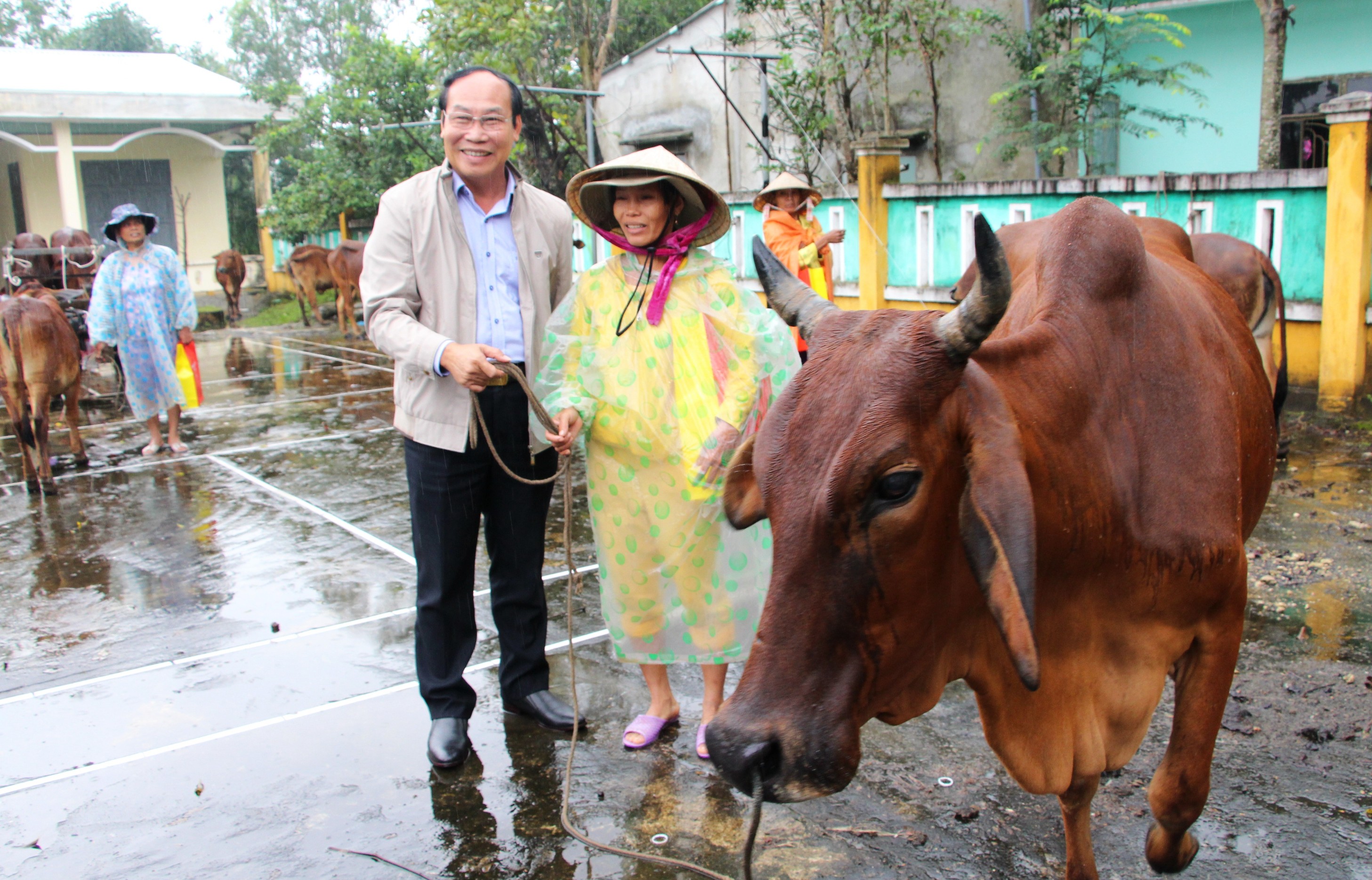 Ông Võ Xuân Ca trực tiếp trao bò cho hộ chị Phạm Thị Ngọc Ánh, thôn An Chánh