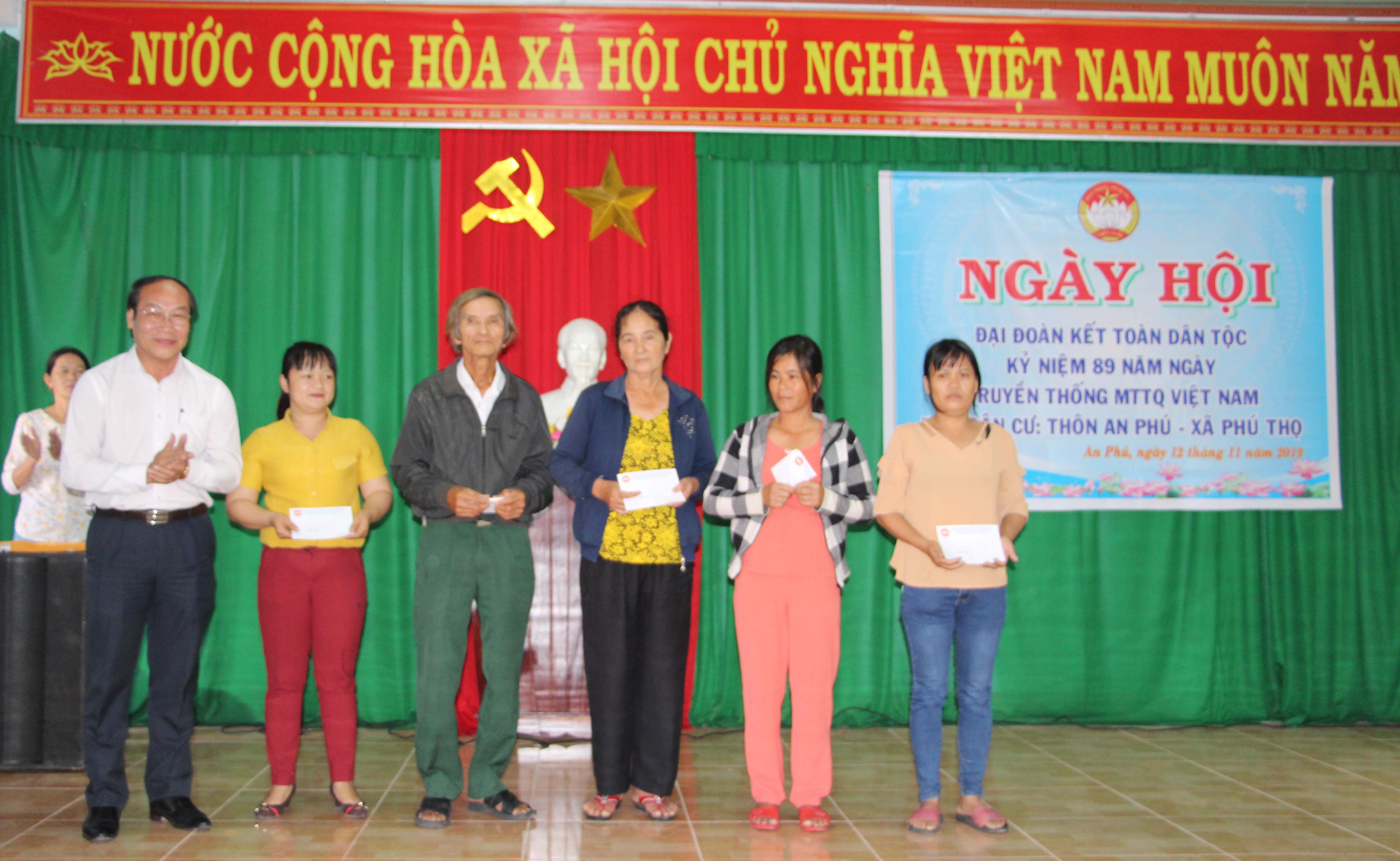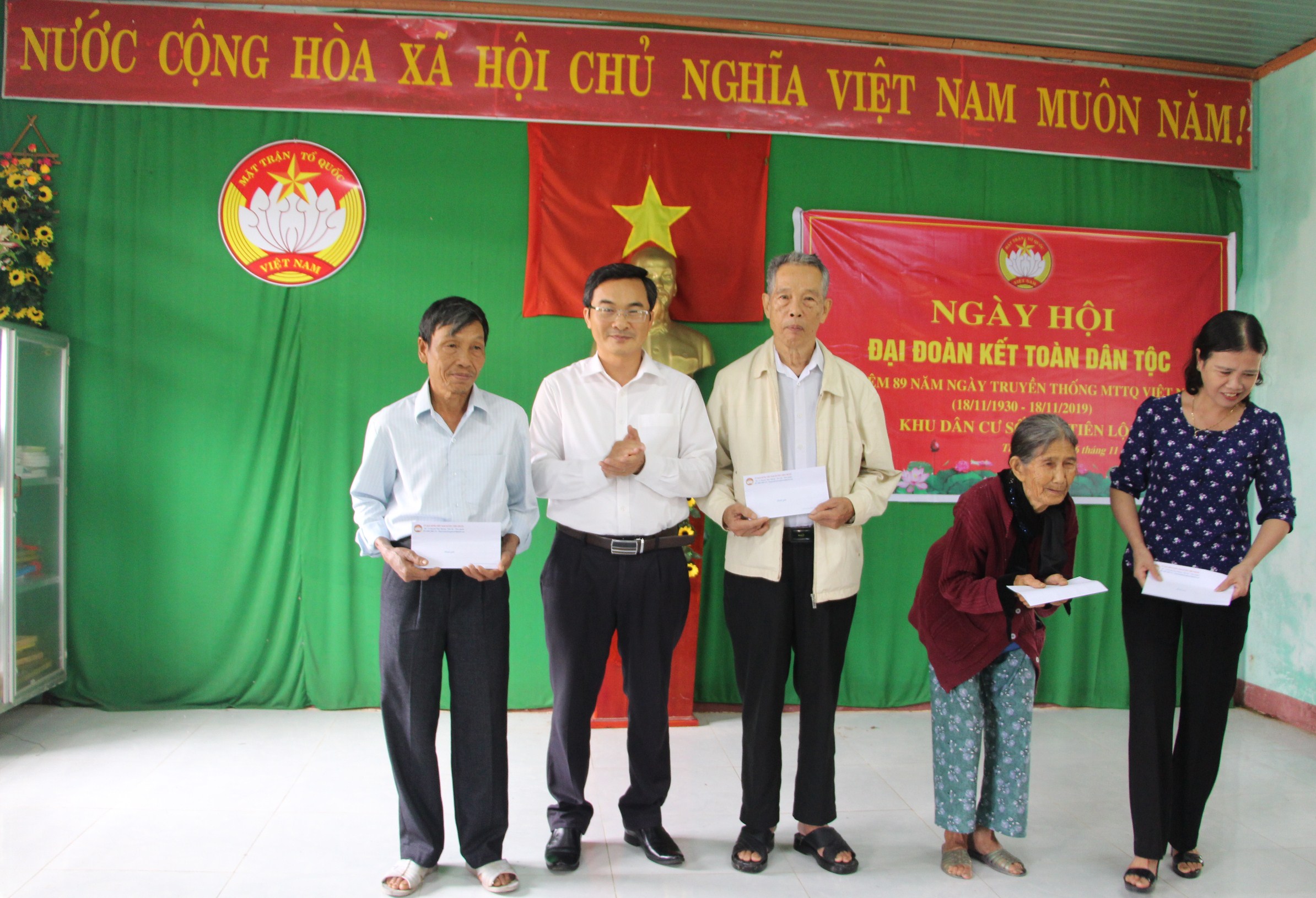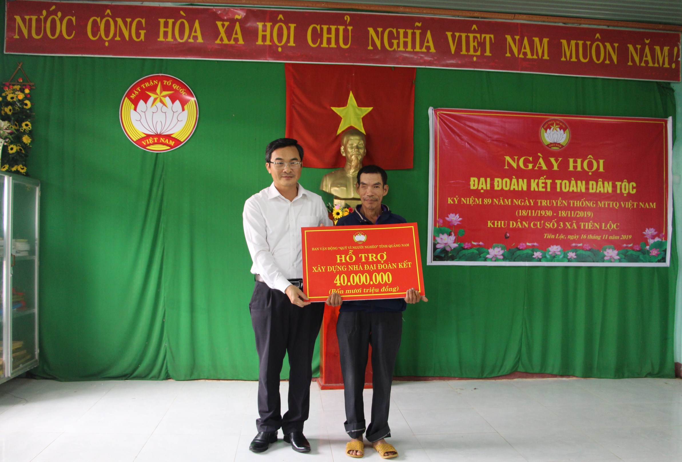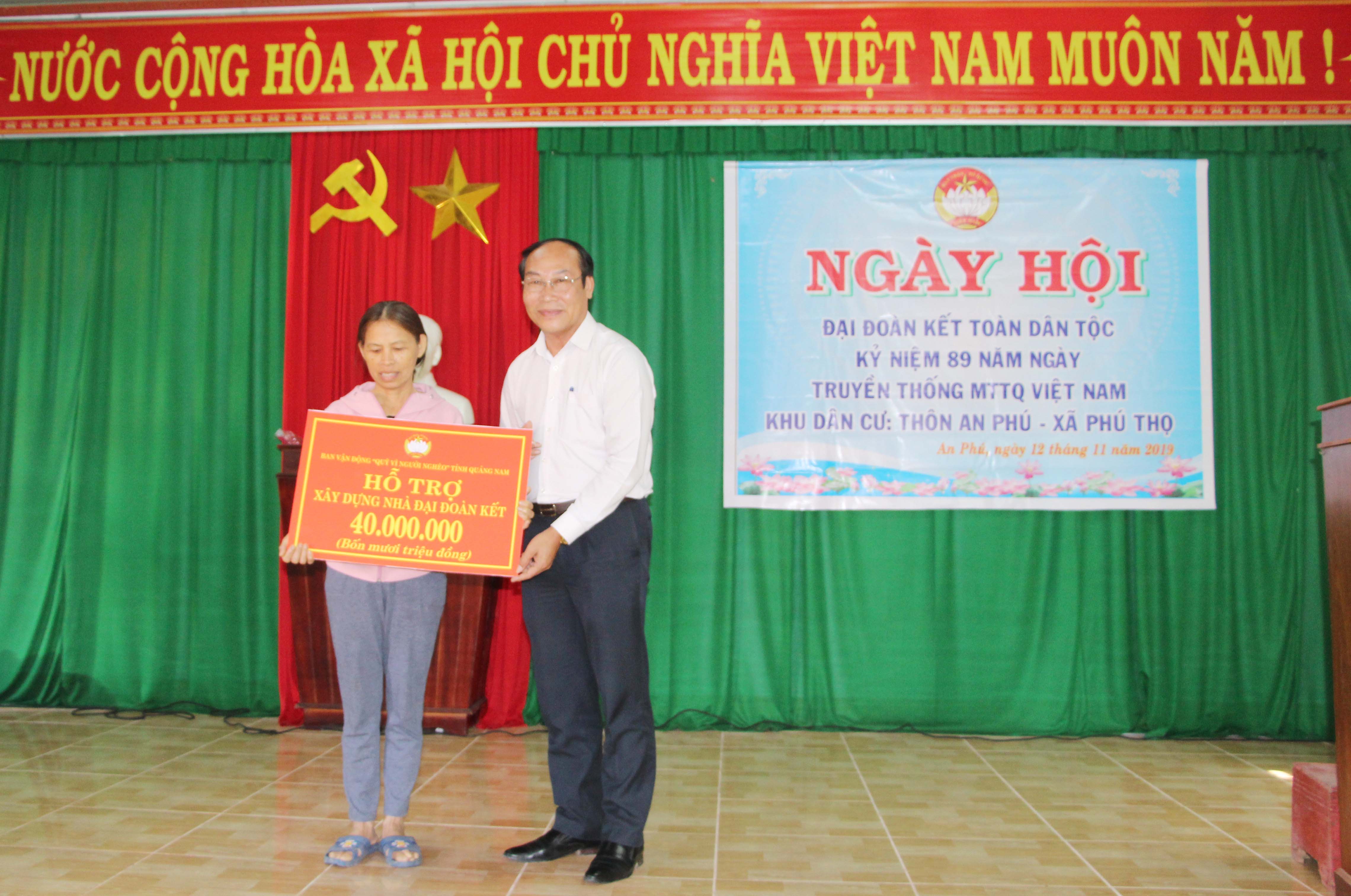 Nhân dịp về dự ngày hội, thay mặt lãnh đạo Ủy ban MTTQ Việt Nam tỉnh, Ông Nguyễn Phi Hùng trao tặng 01 nhà Đại đoàn kết và 05 suất quà cho những hộ nghèo, có hoàn cảnh khó khăn trong thôn./