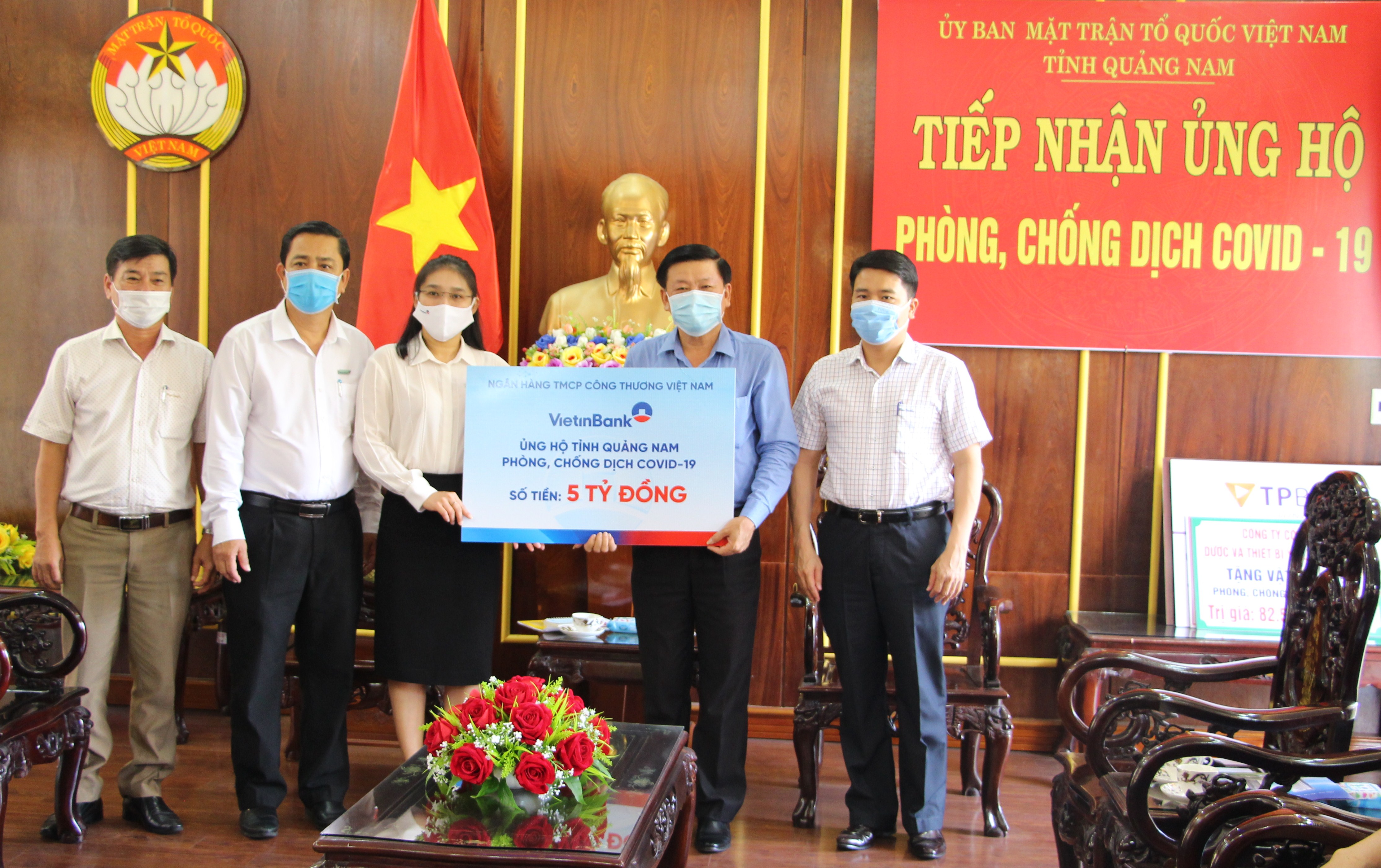 Ông Võ Xuân Ca- UVBTV, Chủ tịch Ủy ban MTTQ Việt Nam tỉnh và ông Trần Văn Tân- Phó Chủ tịch UBND tỉnh tiếp nhận và thay mặt chính quyền, nhân dân Quảng Nam ghi nhận, trân quý tình cảm mà các Ngân hàng, Doanh nghiệp đã dành cho Quảng Nam nhằm tiếp sức cùng với Đảng bộ, chính quyền và Nhân dân Quảng Nam tham gia chống dịch. Trong giai đoạn hết sức cấp bách hiện nay, các cơ sở y tế trên địa bàn tỉnh Quảng Nam đang rất cần các vật tư y tế phục vụ cho công tác phòng, chống dịch Covid-19. Vì vậy, Ủy ban MTTQ Việt Nam tỉnh là cơ quan được giao nhiệm vụ tiếp nhận ủng hộ sẽ khẩn trương phân bổ kịp thời nguồn tiền, hàng vận động đến các cơ sở y tế để phục vụ cho công tác phòng, chống dịch bệnh.
