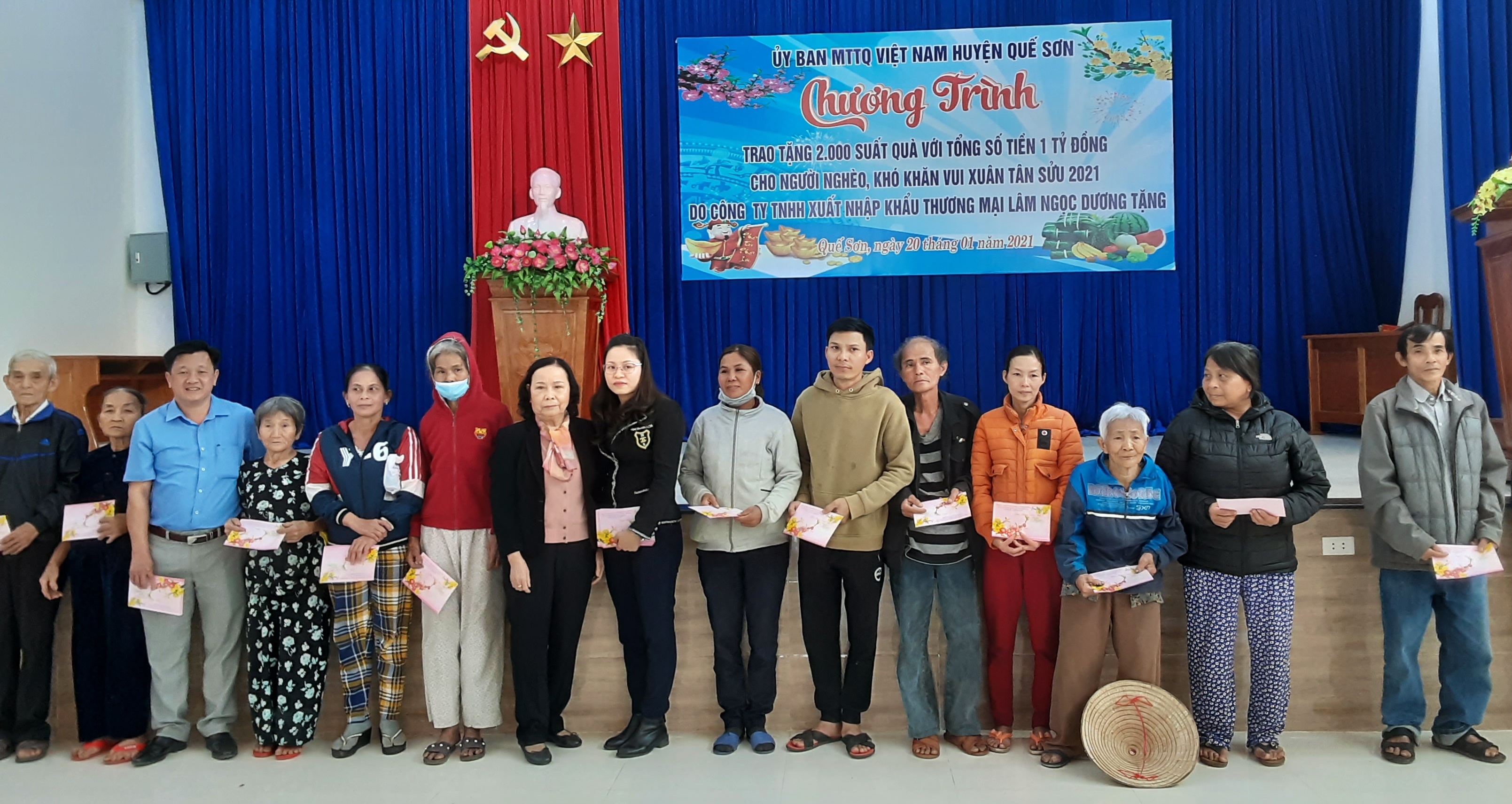 Tại chương trình tổ chức trao quà, công ty TNHH xuất nhập khẩu Lâm Ngọc Dương đã chia sẻ với những khó khăn của nhân dân huyện Quế Sơn chịu ảnh hưởng nặng nề của dịch bệnh Covid-19, mưa, bão diễn ra liên tiếp vào cuối năm 2020 và đến thăm tặng những phần quà tình nghĩa cùng bà con đón Tết cổ truyền yên vui, hạnh phúc. Ông Lý Xuân Phong - Ủy viên Ban Thường vụ Huyện ủy, Chủ tịch Ủy ban MTTQ Việt Nam huyện Quế Sơn chân thành cảm ơn và ghi nhận tấm lòng tương thân tương ái của đơn vị tài trợ và mong muốn bà con vượt qua khó khăn, chuẩn bị lương thực, thực phẩm đón chào một mùa xuân mới trong sự đoàn kết, sẻ chia của các tổ chức, cá nhân giàu lòng thiện nguyện.