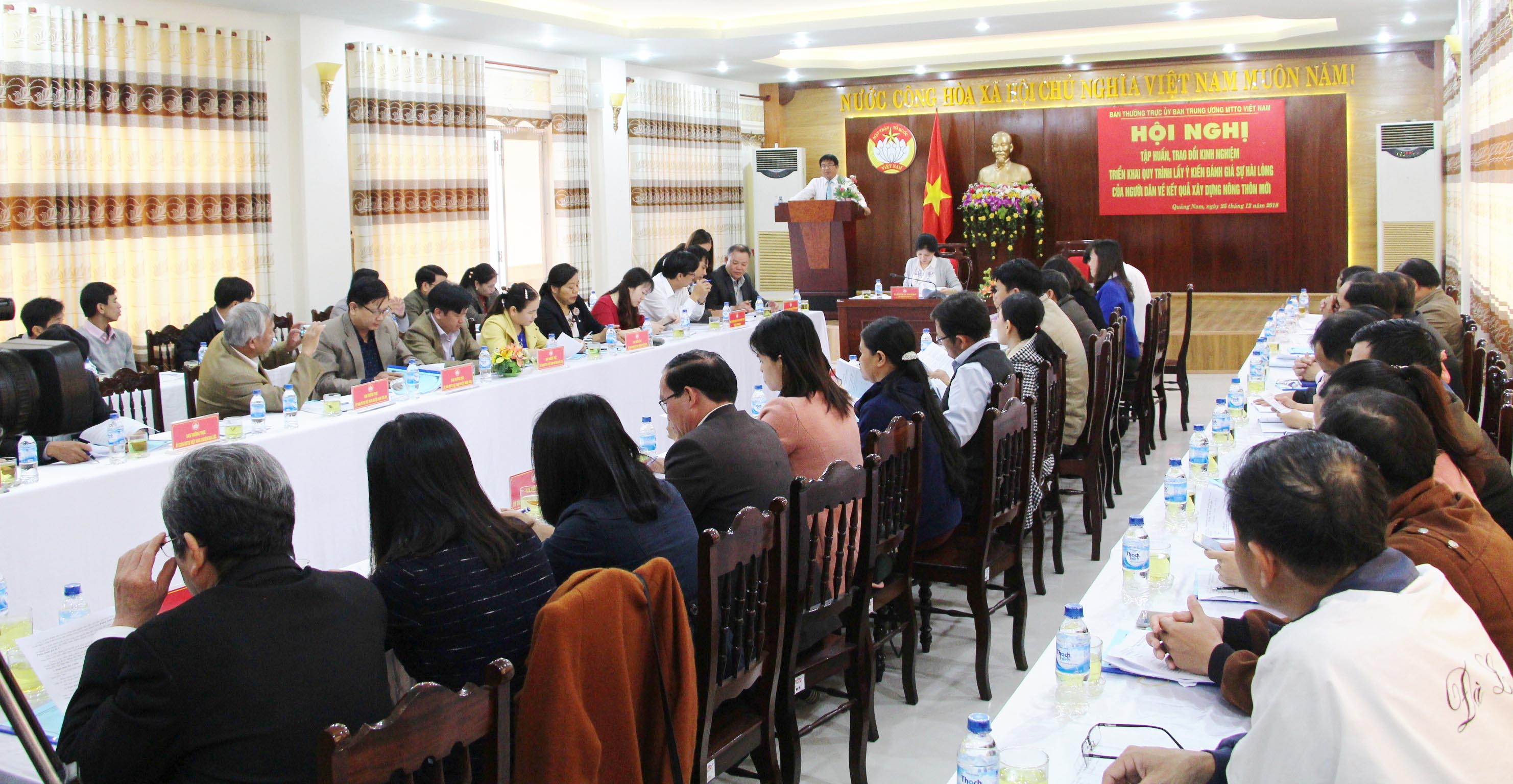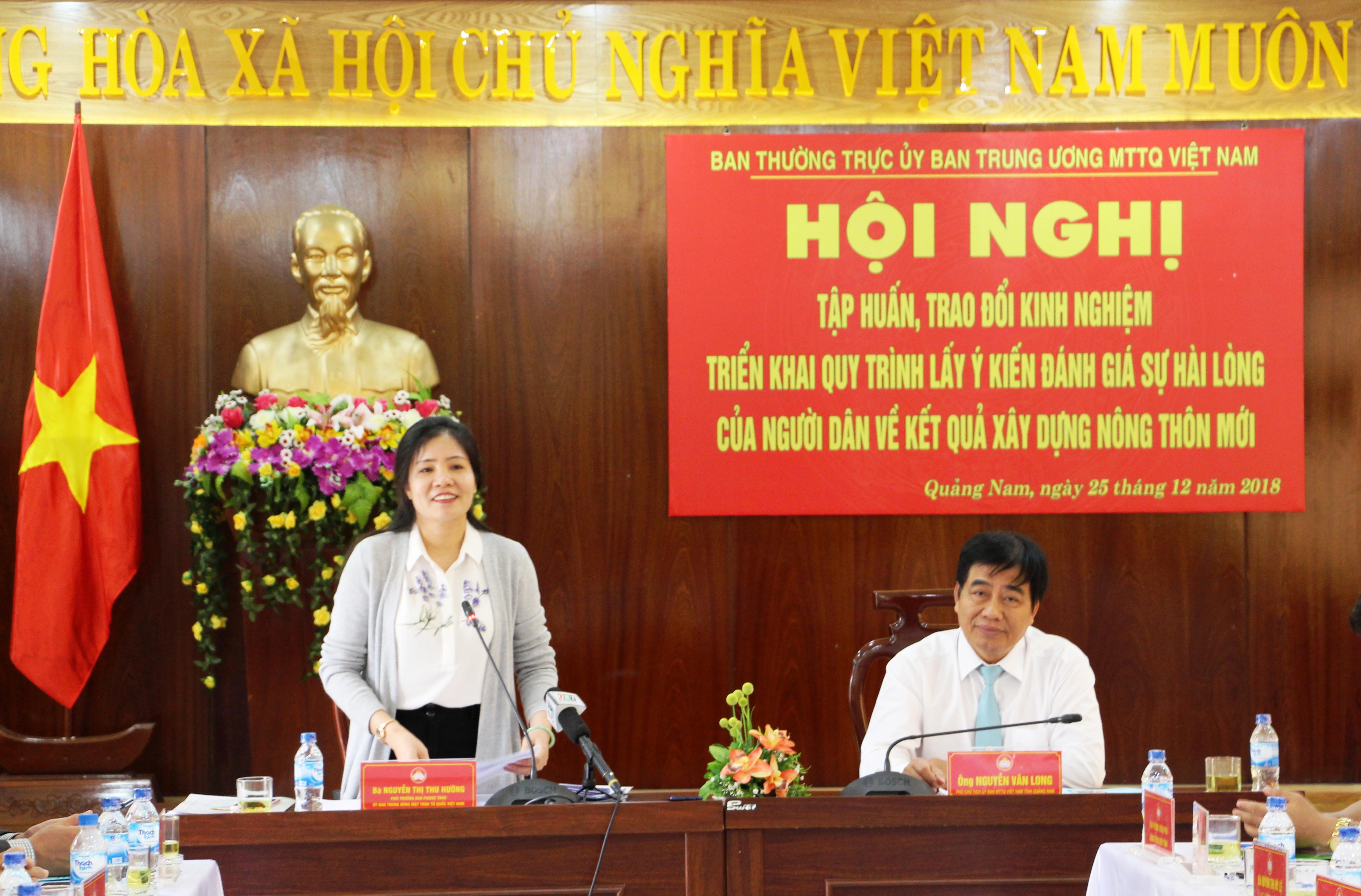 Hôm qua (25/12), bà Nguyễn Thị Thu Hường - Phó Trưởng ban Phong trào Ủy ban Trung ương MTTQ Việt Nam và ông Nguyễn Văn Long - Phó Chủ tịch Ủy ban MTTQ Việt Nam tỉnh Quảng Nam đồng chủ trì hội nghị tập huấn, chia sẻ kinh nghiệm khảo sát việc lấy ý kiến đánh giá sự hài lòng của người dân đối vơi các địa phương phấn đấu đạt chuẩn nông thôn mới, nông thôn mới kiểu mẫu năm 2018, 2019.