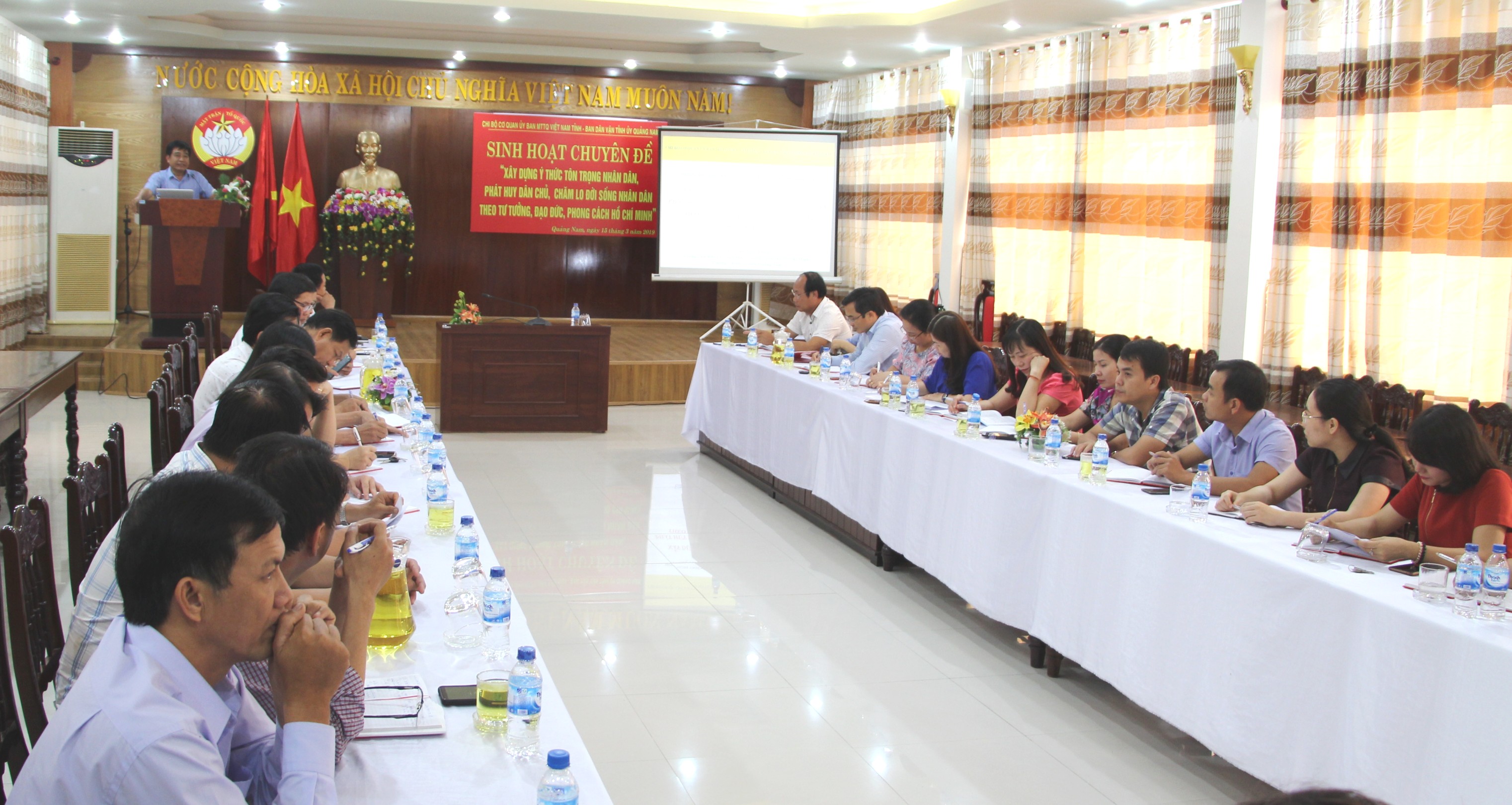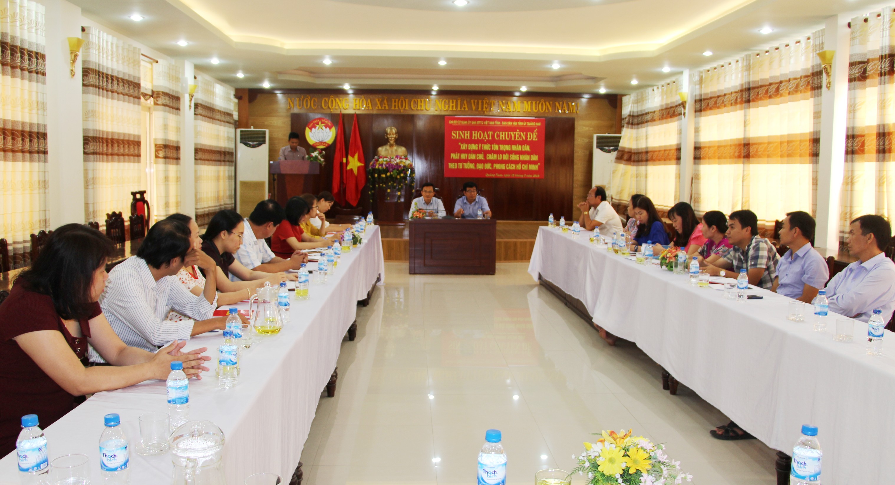 Sau chương trình sinh hoạt chuyên đề, Chi bộ cơ quan Ủy ban MTTQ Việt Nam tỉnh tiếp tục chủ trì tổ chức sinh hoạt tọa đàm để từng tổ Đảng, từng cán bộ đảng viên trao đổi, thảo luận nhằm làm sáng tỏ những chức năng, nhiệm vụ mà mỗi cán bộ Mặt trận phải ý thức thực hiện trong giai đoạn hiện nay. Mỗi tổ đảng nêu lên từng khái niệm về Tôn trọng nhân dân; Phát huy dân chủ; Chăm lo đời sống nhân dân. Qua 3 tham luận được trình bày, đã có hơn 10 ý kiến tham gia trao đổi để hiểu rõ hơn về ý nghĩa, tầm quan trọng của từng nội dung trong Chuyên đề, về ý thức và trách nhiệm của Mặt trận với chức năng đại diện, bảo vệ quyền và lợi ích hợp pháp, chính đáng của nhân dân.