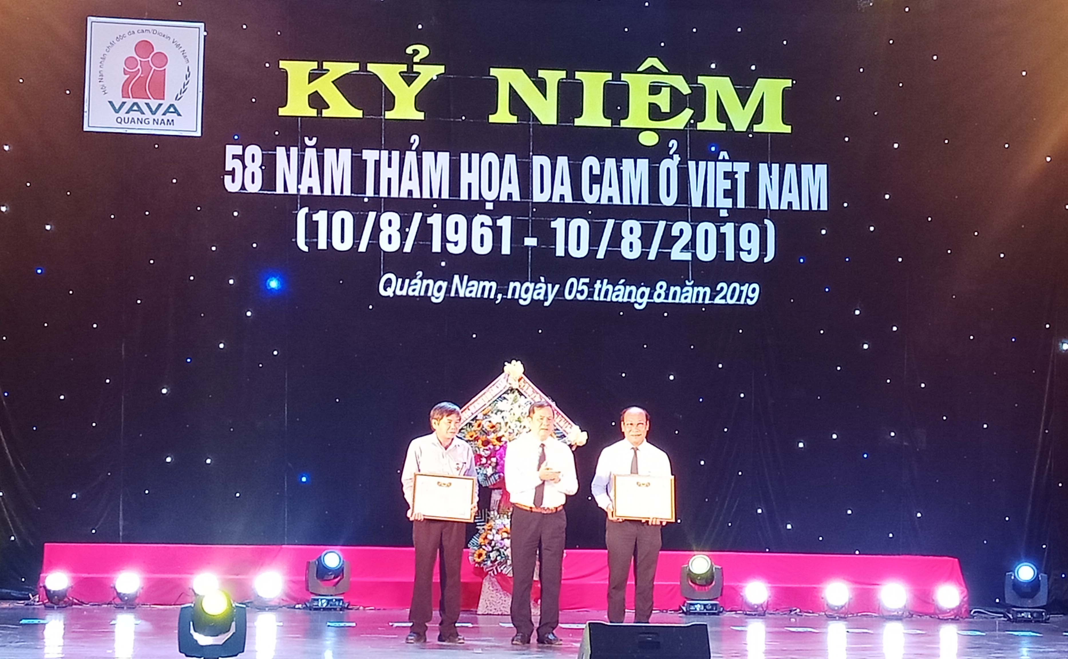 Nhân dịp này, Trung ương Hội nạn nhân CĐDC/Dioxin Việt Nam tặng kỷ niệm chương cho ông Võ Xuân Ca - Chủ tịch Ủy ban MTTQ Việt Nam tỉnh và các đồng chí lãnh đạo tỉnh đã có nhiều quan tâm, giúp đỡ nạn nhân CĐDC/Dioxin tỉnh trong thời gian qua. Trao 46 suất quà tặng các nạn nhân da cam có hoàn cảnh đặc biệt khó khăn, trong đó quỹ “Vì người nghèo” tỉnh trao 18 suất, mỗi suất trị giá 01 triệu đồng.
