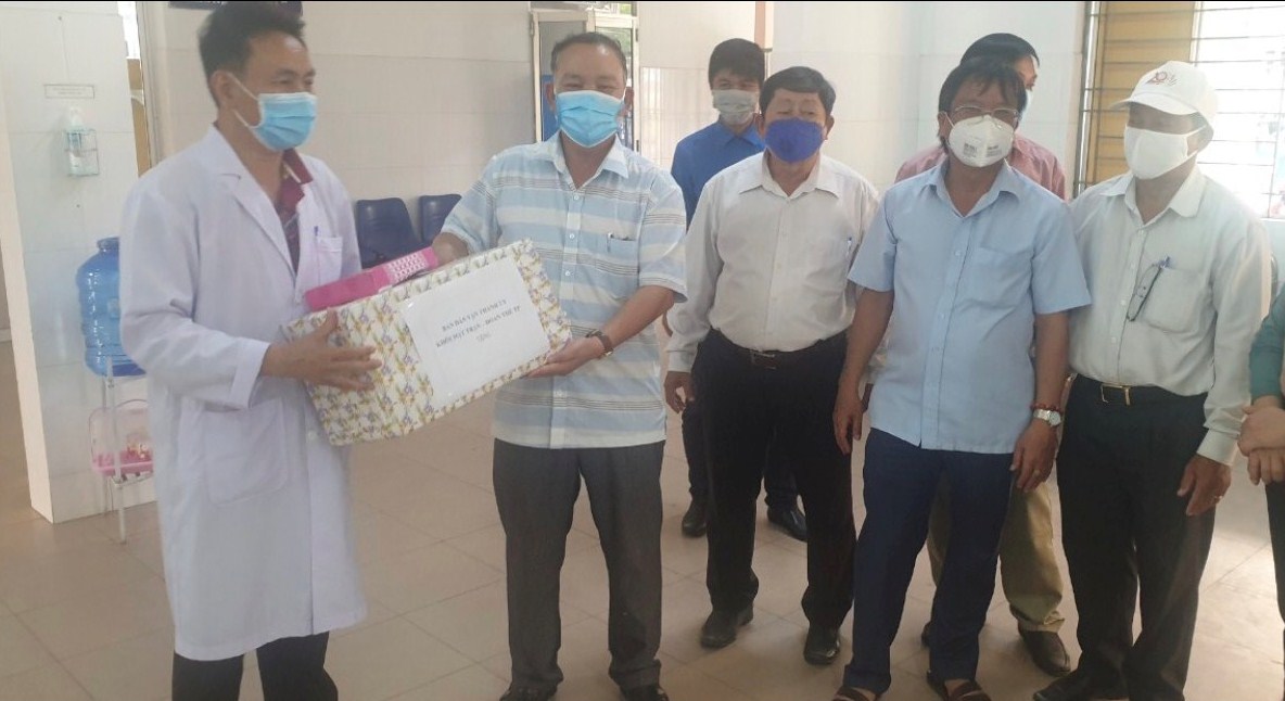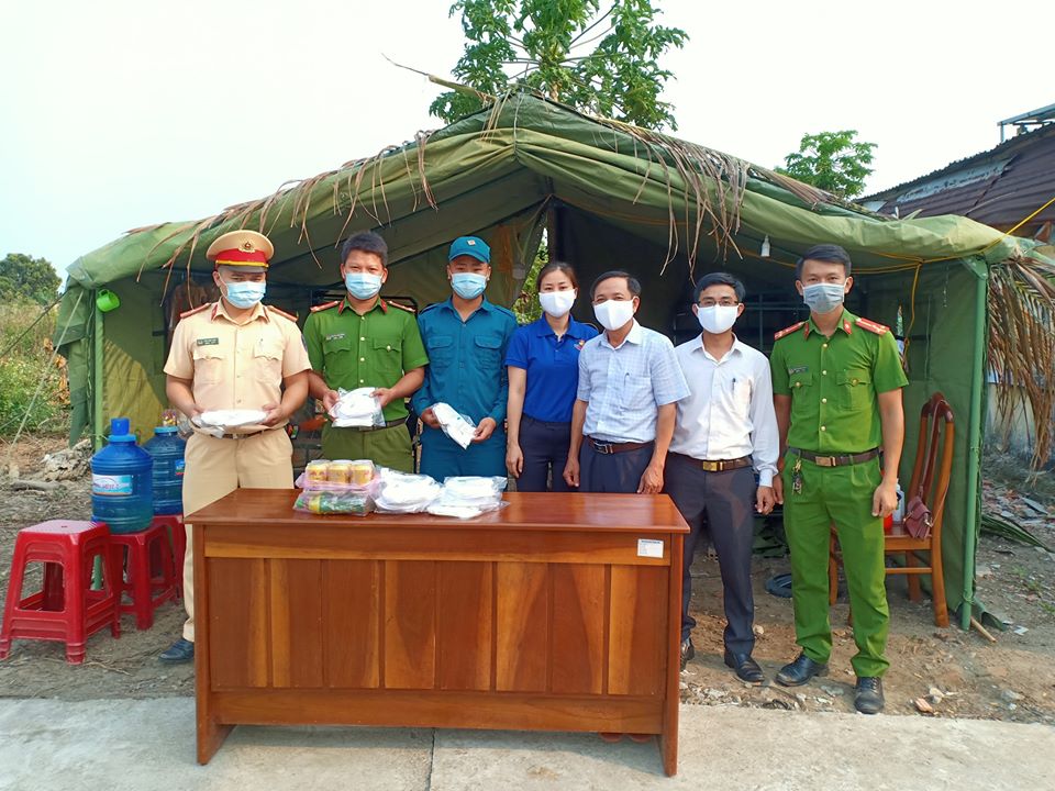 Tại đây, ông Phan Ngọc Hải: Chủ tịch Ủy ban MTTQ Việt Nam thị xã và bà Đặng Thị Bảo Trinh: Bí thư Thị đoàn đã động viên, chia sẻ những khó khăn đối với những chiến sỹ công an, quân sự, lực lượng dân quân tự vệ làm nhiệm vụ tại khu vực cách ly. Đồng thời tặng 100 khẩu trang vải do công ty May Hòa Thọ tài trợ.