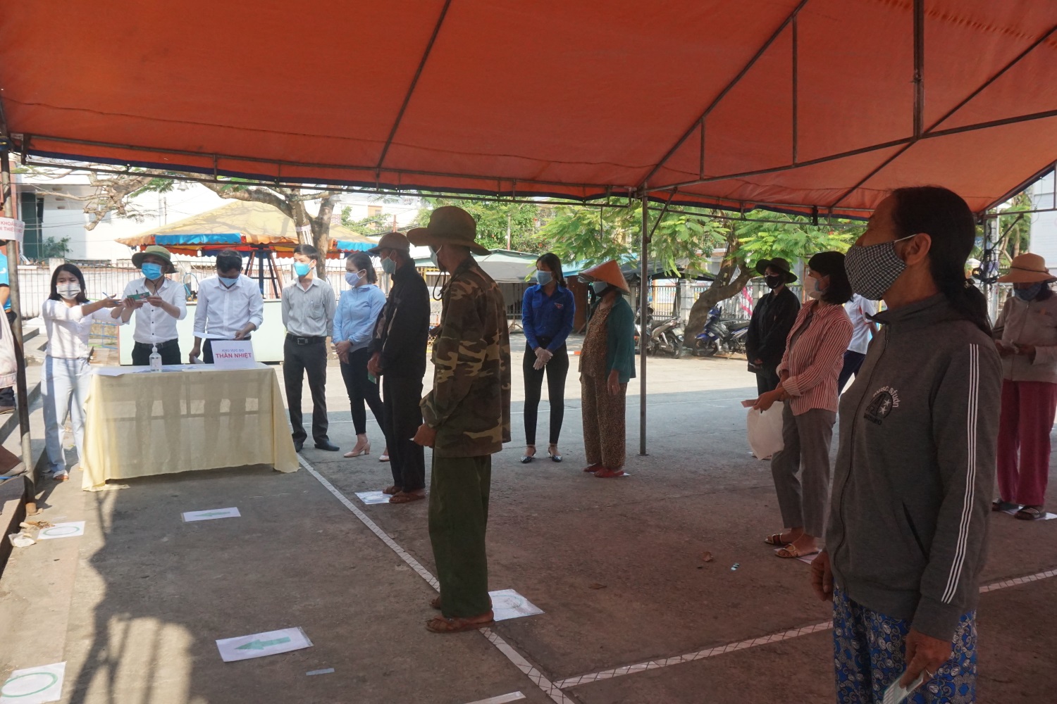 Hộ nghèo, hộ cận nghèo được hướng dẫn đứng giãn cách khi tham gia mua hàng