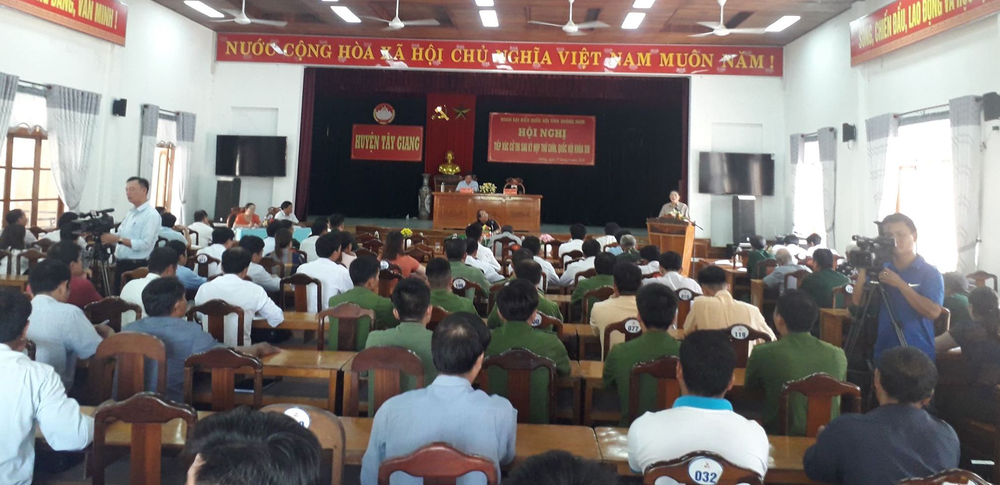 Chiều ngày 25/6/2020, Đoàn đại biểu Quốc hội khóa XIV tỉnh Quảng Nam tiếp xúc cử tri huyện Tây Giang. Có gần 150 cử tri tham gia là lãnh đạo và một số cán bộ CC, VC, lực lượng vũ trang đang công tác trên địa bàn huyện, lãnh đạo các Đồn Biên phòng và đại diện cử tri của các xã trên địa bàn huyện