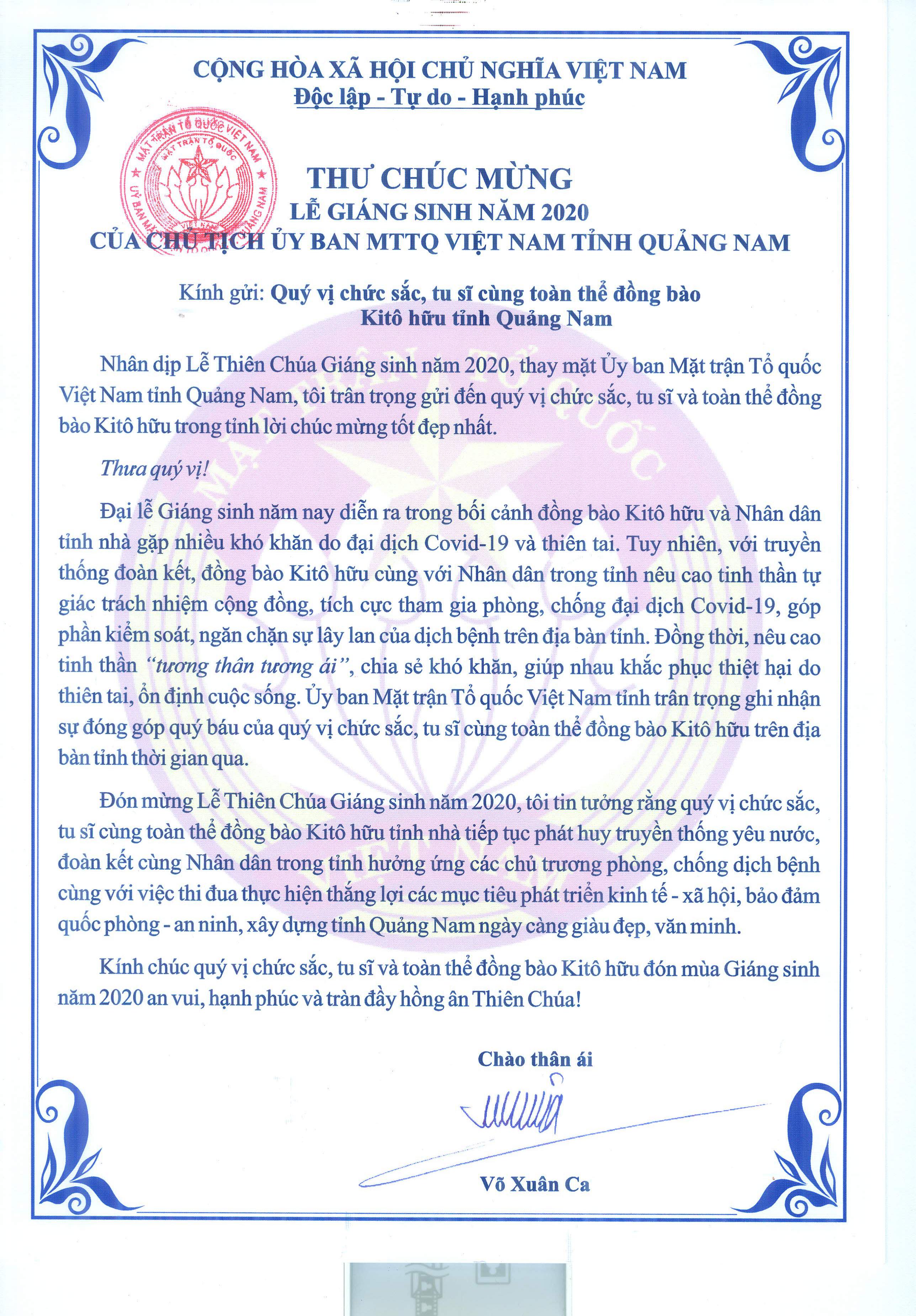 Thư chúc mừng Lễ Giáng sinh năm 2020 của Chủ tịch Ủy ban MTTQ Việt Nam tỉnh Quảng Nam