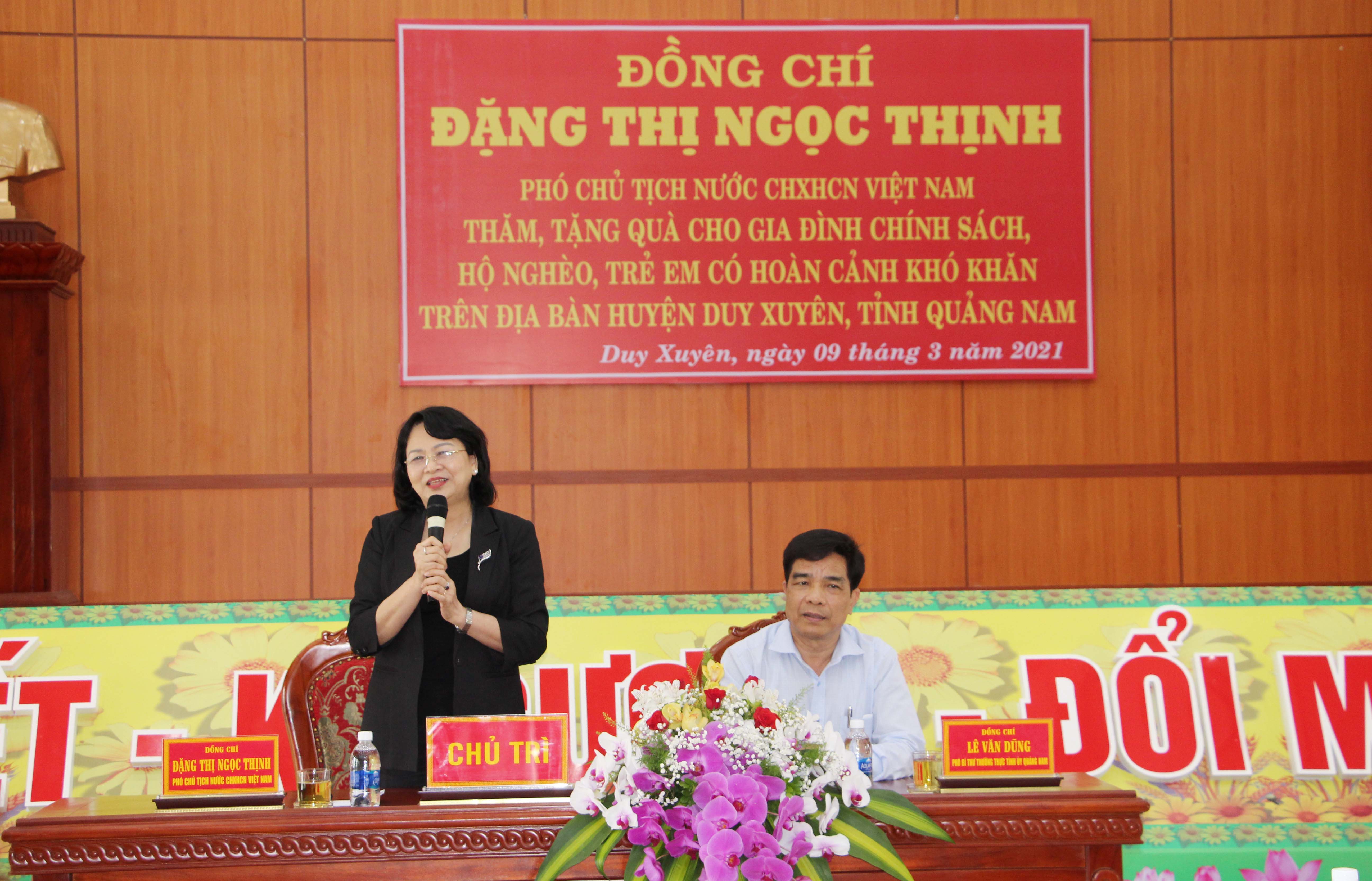 Thay mặt lãnh đạo Đảng, Nhà nước, Phó Chủ tịch nước CHXHCNVN Đặng Thị Ngọc Thịnh gửi lời thăm hỏi, chúc sức khỏe đến các gia đình chính sách, người có công và các em học sinh; đồng thời chúc mừng những thành tựu về kinh tế - xã hội, an ninh - quốc phòng, cũng như công tác chăm lo xây dựng Đảng, chăm lo người có công cách mạng, gia đình chính sách, người nghèo, trẻ em… của 2 địa phương. Trong năm 2020 mặc dù bị ảnh hưởng của đại dịch Covid-19 và bão lũ đã gây thiệt hại về người và của, dưới sự lãnh đạo của cấp ủy, chình quyền địa phương và sự đồng lòng của bà con nhân dân đã vượt qua khó khăn, nhanh chóng ổn định cuộc sống.