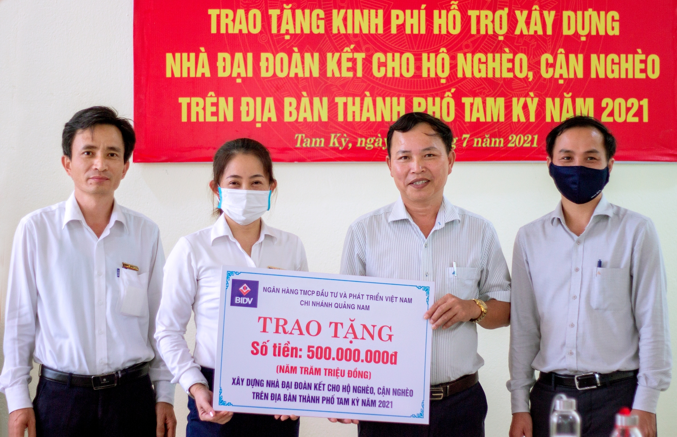 Qua rà soát, nắm bắt thực trạng nhà ở của hộ nghèo, hộ cận nghèo trên địa bàn thành phố Tam Kỳ, Công đoàn Cơ sở BIDV chi nhánh Quảng Nam cùng các đồng chí lãnh đạo địa phương khảo sát thực tế tại các xã, phường trên địa bàn thành phố thống nhất, ngân hàng BIDV hỗ trợ xây nhà cho đối tượng Hộ nghèo với số tiền là 500 triệu đồng để xây dựng 10 nhà đại đoàn kết (50.000.000 đồng/xây mới/hộ gia đình). Với số tiền này, Ủy ban MTTQ Việt Nam thành phố sẽ phối hợp với Phòng Lao động – TB&XH thành phố, Uỷ ban MTTQ Việt Nam các phường/xã có đối tượng thụ hưởng chương trình phối hợp với đơn vị tài trợ thực hiện khảo sát, hoàn thiện thủ tục hồ sơ, giao Ủy ban MTTQ Việt Nam các xã, phường thực hiện giám sát quá trình thi công nhà Đại đoàn kết.