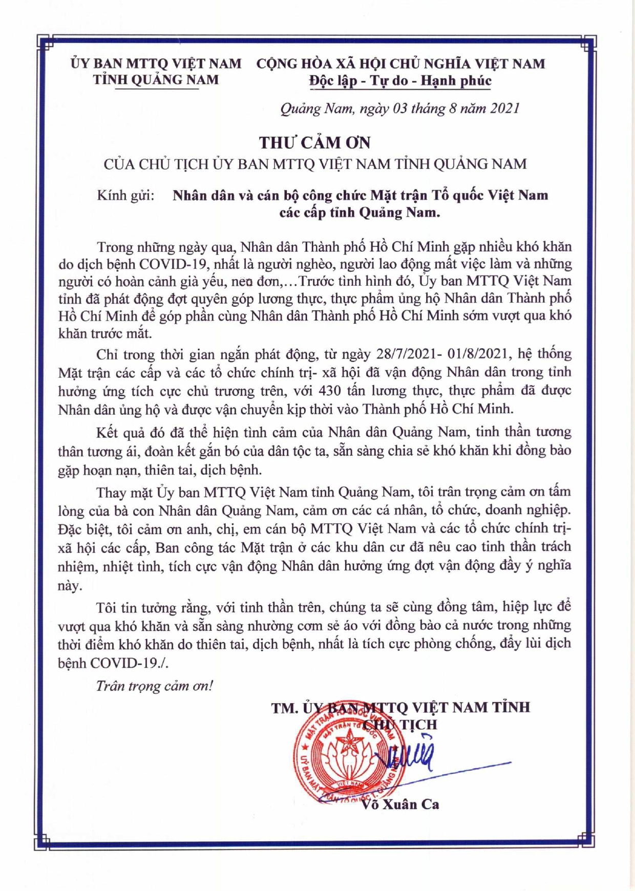 Thư cảm ơn của Chủ tịch Ủy ban MTTQ Việt Nam gửi Nhân dân và cán bộ, công chức Mặt trận Tổ quốc Việt Nam các cấp tỉnh Quảng Nam