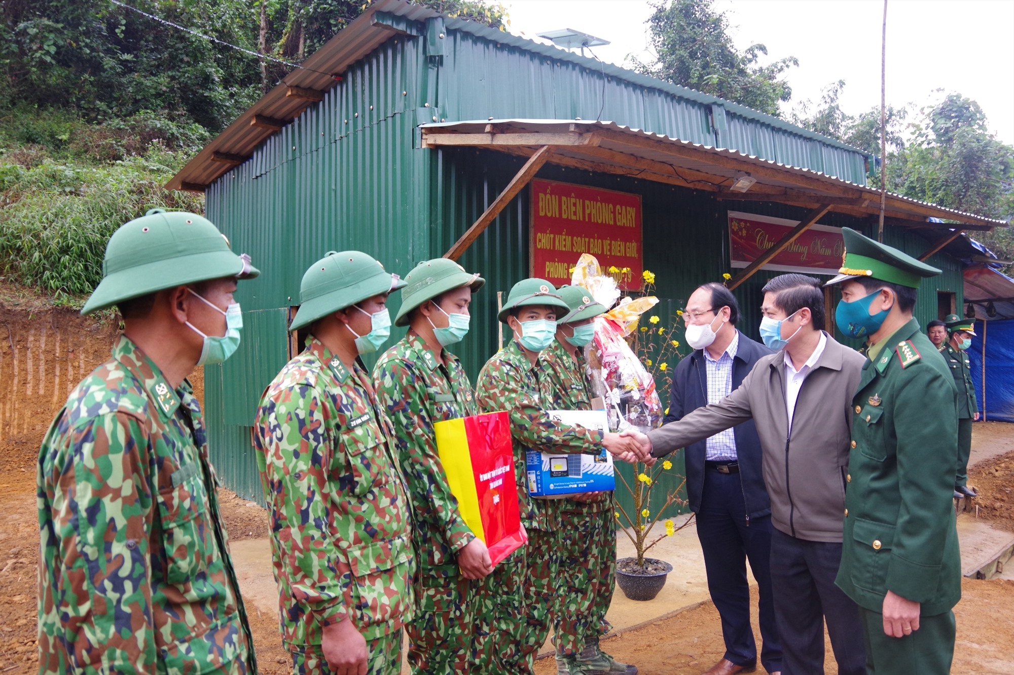 Chủ tịch Ủy ban MTTQ Việt Nam tỉnh Võ Xuân Ca và Chủ nhiệm Ủy ban Kiểm tra Tỉnh ủy Phan Thái Bình thăm, chúc tết lực lượng cắm chốt phòng chống Covid-19. Ảnh VĂN VINH.jpg