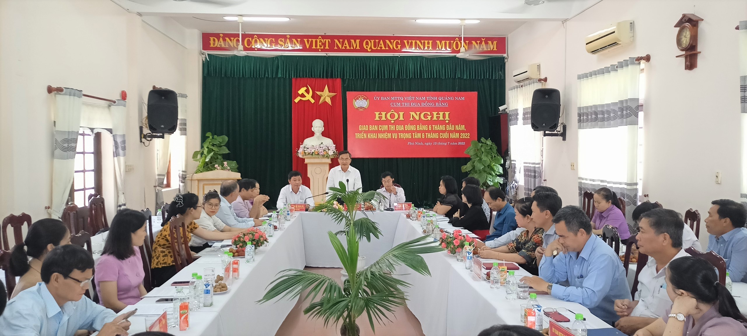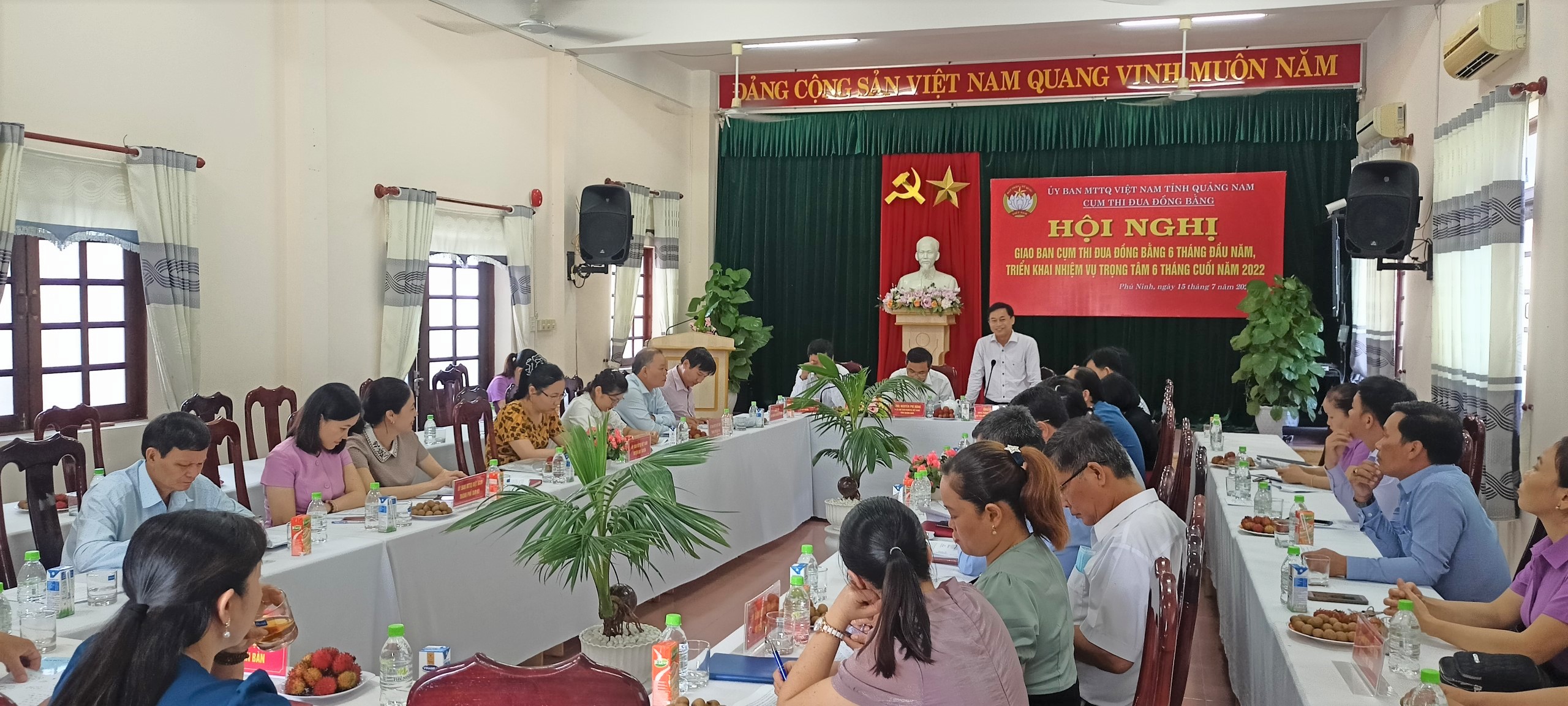 Hôm qua (15/7), tại huyện Phú Ninh, cụm thi đua 09 huyện đồng bằng tổ chức giao ban Cụm thi đua 06 tháng đầu năm 2022. Ông Nguyễn Phi Hùng, Phó Chủ tịch Thường trực Uỷ ban MTTQ Việt Nam tỉnh; ông Nguyễn Thanh Hải, Chủ tịch Ủy ban MTTQ Việt Nam huyện Duy Xuyên; ông Đặng Vân, Chủ tịch Ủy ban MTTQ Việt Nam huyện Phú Ninh đồng chủ trì hội nghị. Tham dự hội nghị có Lê Văn Ninh, Phó Bí thư Thường trực Huyện ủy Phú Ninh; các ông bà trong Ban Thường trực Ủy ban MTTQ Việt Nam tỉnh; Chủ tịch, Phó Chủ tịch, Ủy viên Thường trực phụ trách công tác thi đua của 9 huyện đồng bằng cùng tham dự.