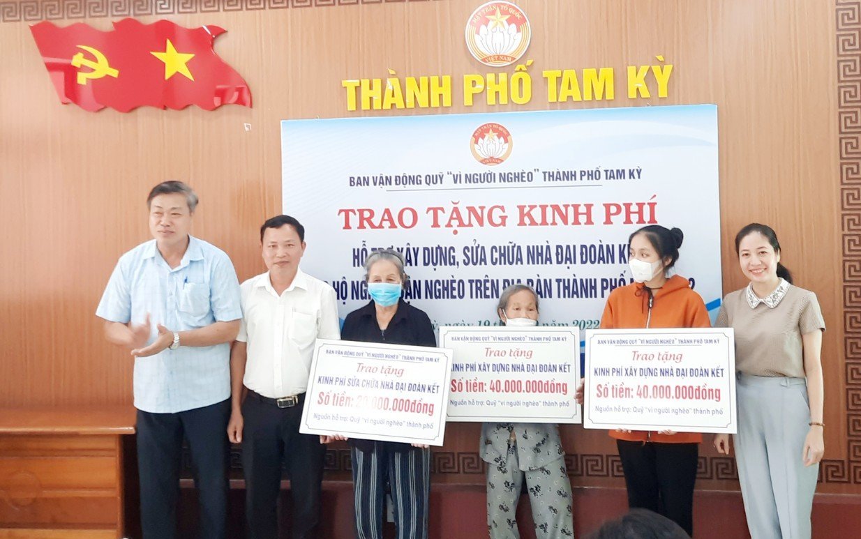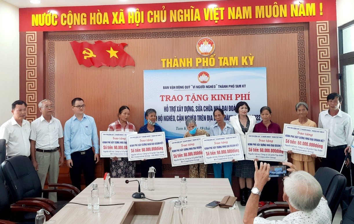 Trong số 9 trường hợp hộ nghèo, hộ cận nghèo được hỗ trợ kinh phí xây dựng, sửa chữa nhà đại đoàn kết lần này thì có 6 trường hợp được Tập đoàn Bin Corporation Group của doanh nhân Lê Hùng Anh - một người con quê hương Tam Kỳ và sự kết nối chia sẻ của cơ quan Đài tiếng nói Việt Nam VOV Miền Trung hỗ trợ xây mới nhà với mức 60 triệu đồng/nhà. 3 trường hợp còn lại được hỗ trợ từ nguồn “Qũy vì người nghèo” của thành phố Tam Kỳ trong đó có 2 nhà xây mới (40 triệu đồng/nhà) và 1 nhà sửa chữa (20 triệu đồng/nhà).