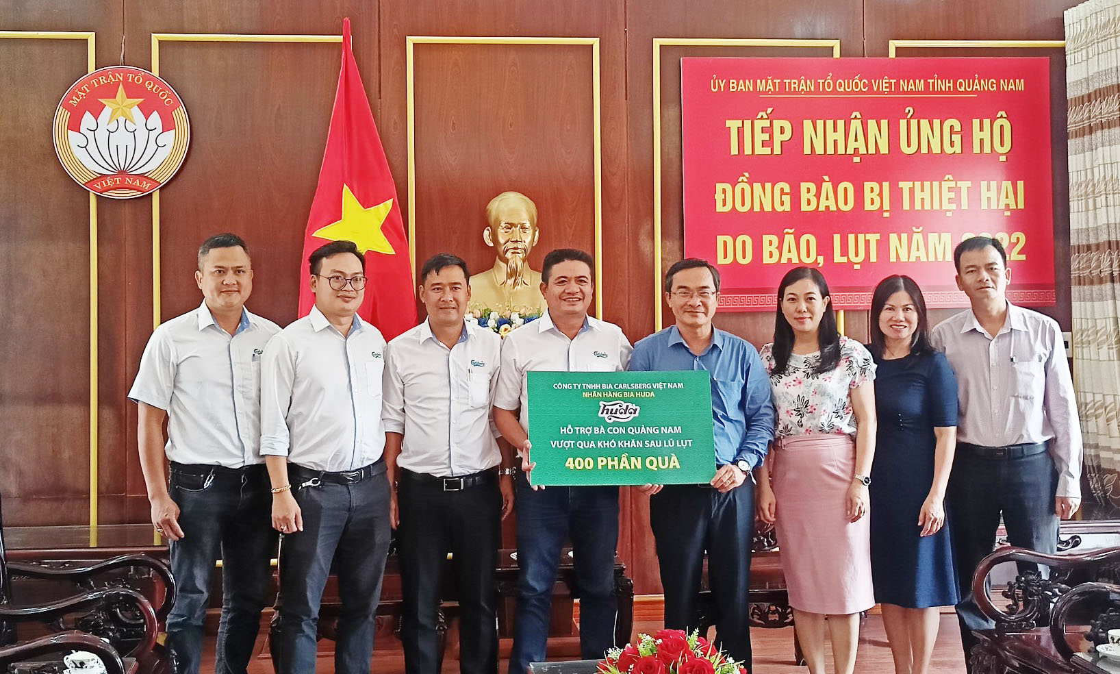 Thay mặt lãnh đạo Công ty TNHH Bia Carlsberg Việt Nam, ông Võ Thương gửi lời thăm hỏi, chia sẻ về những thiệt hại, mất mát mà bà con nhân dân tỉnh Quảng Nam vừa gánh chịu trong cơn bão số 4 vừa qua và trao hỗ trợ 400 suất quà gồm các nhu yếu phẩm, mỗi suất trị giá 350.000đ (gạo, dầu ăn, nước mắm, mì tôm, đường) giúp bà con nhân dân vượt qua khó khăn sau cơn bão.