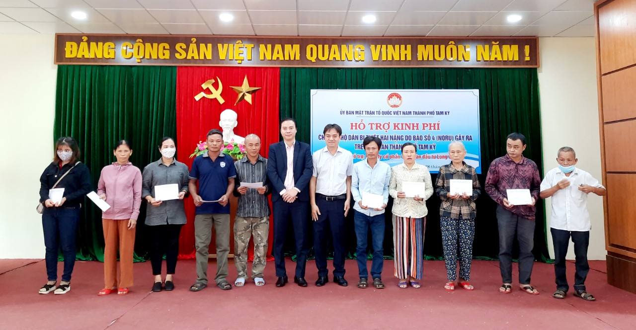 Sáng ngày 28.10, Uỷ ban MTTQ Việt Nam thành phố Tam Kỳ phối hợp với công ty cổ phần tập đoàn đầu tư Long Giang tổ chức trao kinh phí hỗ trợ cho các hộ dân bị thiệt hại do cơn bão số 4 gây ra trên địa bàn thành phố Tam Kỳ. Tham dự chương trình có ông Nguyễn Duy Ân - Phó Bí thư thường trực Thành ủy Tam Kỳ.