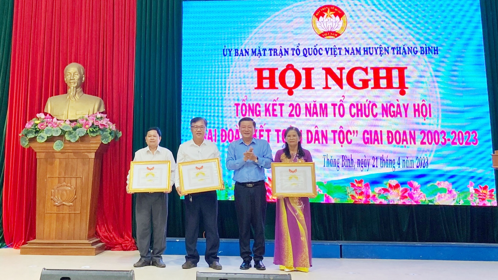 Cũng tại hội nghị đã biểu dương, trao Bằng khen của Ủy ban MTTQ Việt Nam tỉnh cho 03 tập thể đã có thành tích tốt trong triển khai thực hiện Cuộc vận động “Toàn dân đoàn kết xây dựng nông thôn mới, đô thị văn minh” năm 2023; trao tặng giấy khen của UBND huyện cho 05 tập thể và 09 cá nhân; giấy khen của Ủy ban MTTQ Việt Nam huyện cho 18 tập thể và 14 cá nhân đã có thành tích tốt trong 20 năm tổ chức Ngày hội Đại đoàn kết toàn dân tộc giai đoạn 2003-2023./.