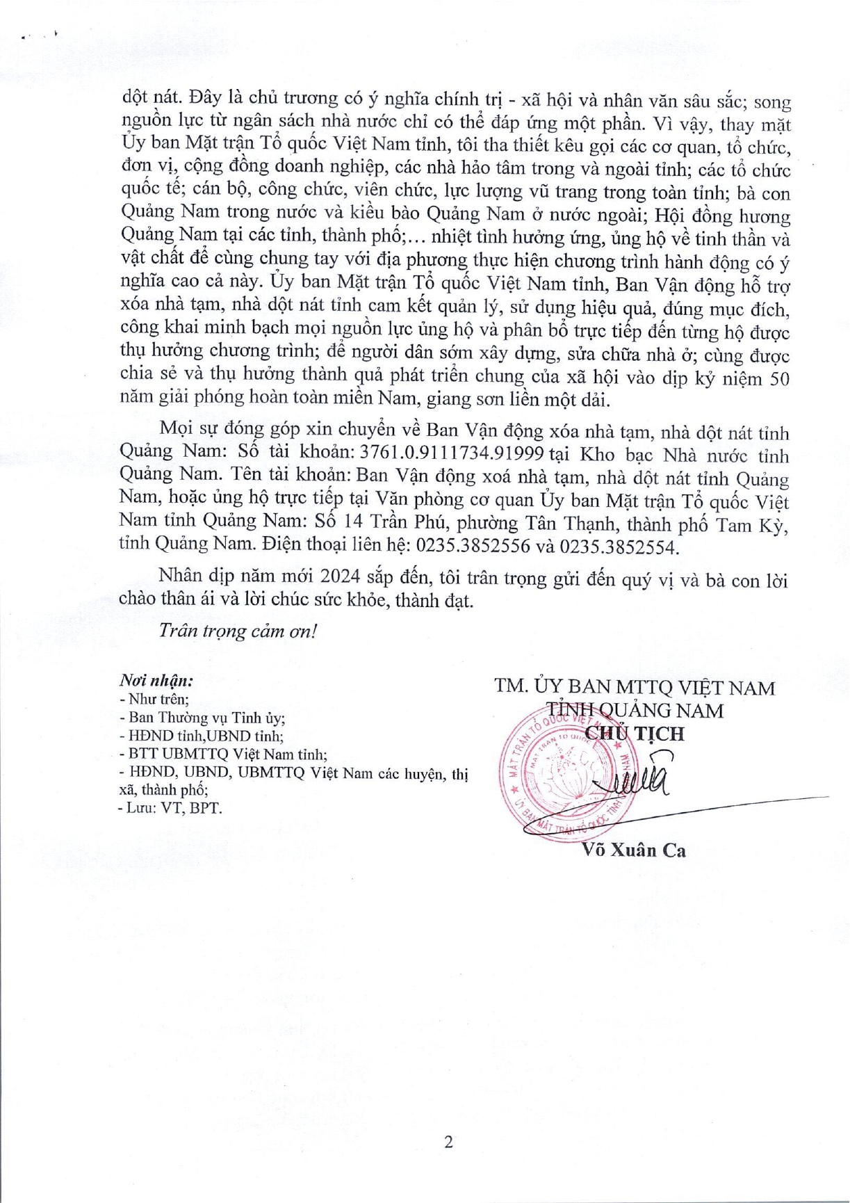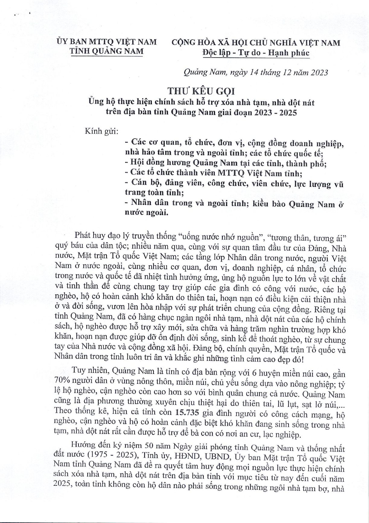 Thư kêu gọi ủng hộ thực hiện chính sách hỗ trợ xoá nhà tạm, nhà dột nát trên địa bàn tỉnh giai đoạn 2023-2025