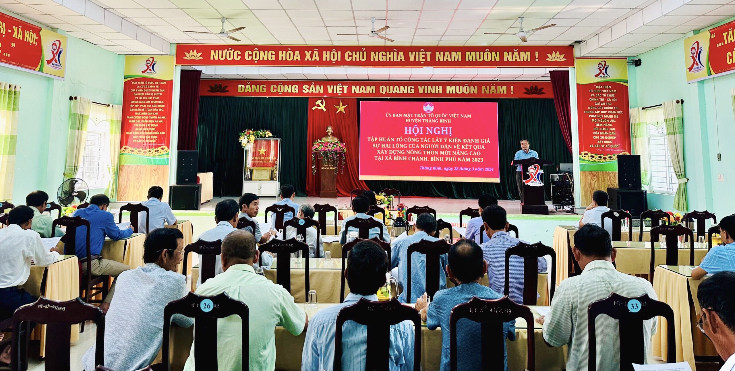 Ngày 28/3/2024, Ban Thường trực Ủy ban MTTQ Việt Nam huyện Thăng Bình tổ chức Hội nghị tập huấn công tác lấy ý kiến đánh giá sự hài lòng của người dân đối với kết quả xây dựng nông thôn mới (NTM) nâng cao. Tham dự hội nghị có ông Nguyễn Văn Đông - HUV, Phó Chủ tịch Ủy ban MTTQ Việt Nam huyện; đại biểu lãnh đạo UBND, Ban Thường trực Ủy ban MTTQ Việt Nam, các tổ chức chính trị - xã hội xã; Bí thư chi bộ, Trưởng Ban Công tác Mặt trận, Trưởng thôn và đại diện các hộ dân của 02 xã Bình Chánh, Bình Phú.