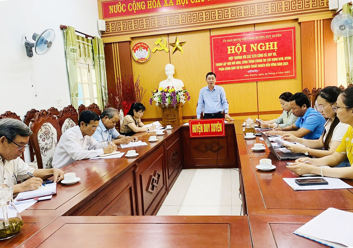 Chiều ngày 25/4/2024, Ủy ban MTTQ Việt Nam huyện Duy Xuyên chủ trì tổ chức Hội nghị hiệp thương với các tổ chức thành viên để củng cố, duy trì, thành lập mới mô hình mới, công trình chung tay xây dựng nông thôn mới, đô thị văn minh; phân công giúp đỡ hộ nghèo thoát nghèo bền vững năm 2024. Đồng thời, tổ chức sơ kết kết quả thực hiện Chương trình phối hợp số 07/CTrPH-MTTQ ngày 07/4/2017 giữa Ủy ban MTTQ Việt Nam huyện với các tổ chức thành viên tham gia thực hiện Cuộc vận động “Toàn dân đoàn kết xây dựng nông thôn mới, đô thị văn minh” năm 2023. Ông Nguyễn Thanh Hải - UVBTV Huyện ủy, Chủ tịch Ủy ban MTTQ Việt Nam huyện chủ trì Hội nghị.