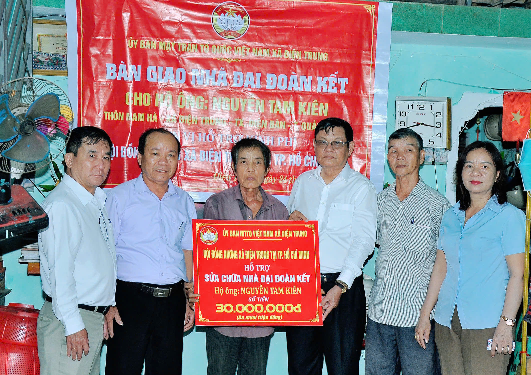 Trong vòng ba năm, từ 2022 đến nay, Mặt trận xã đã huy động trên 405 triệu đồng để xây dựng 8 ngôi nhà Đại đoàn kết cho người nghèo. Đặc biệt, Hội đồng hương Điện Trung tại TP. Hồ Chí Minh luôn là đơn vị hỗ trợ lớn, hàng năm không chỉ trao quà cho người già neo đơn và trẻ em tàn tật mà còn đóng góp kinh phí để xây dựng từ một đến hai ngôi nhà Đại đoàn kết. Các cá nhân như anh Nguyễn Văn Hòa (Phó Tổng Giám đốc Ngân hàng ACB) và anh Phạm Phú Chung (Tổng Công ty Cổ phần Phong Phú) cũng đã đóng góp hàng chục triệu đồng mỗi năm để hỗ trợ xây dựng, sửa chữa nhà cho các hộ nghèo.