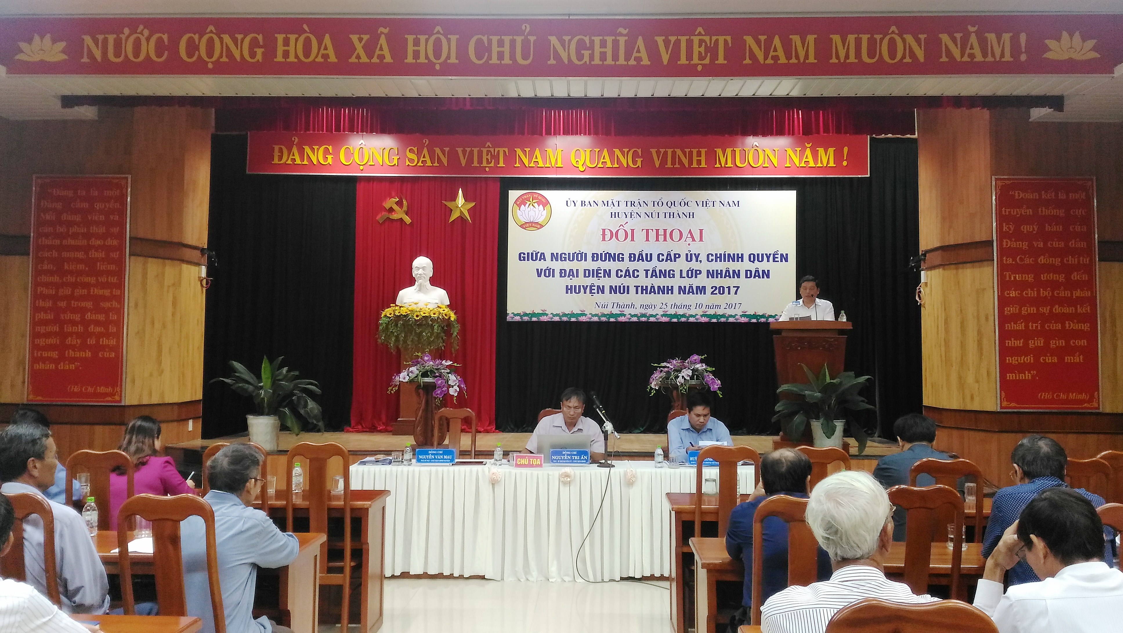 Tại buổi đối thoại, đại diện Mặt trận Tổ quốc Việt Nam, các đoàn thể chính trị-xã hội, các Ban công tác Mặt trận ở khu dân cư, các Tổ đoàn kết, Tổ tự quản và hộ gia đình trên địa bàn huyện Núi Thành đã đối thoại trực tiếp với đồng chí Bí thư Huyện ủy và đồng chí Chủ tịch UBND Huyện với 41 ý kiến chất vấn được đối thoại, trong đó có 20 ý kiến phát biểu trực tiếp. Nội dung đối thoại tập trung vào các vấn đề trọng tâm như: việc xây dựng và thực hiện các quy hoạch, nhất là quy hoạch nông thôn mới, quy hoạch chỉnh trang đô thị; Công tác quản lý nhà nước trên các lĩnh vực, nhất là quản lý đất đai, tài nguyên, khoáng sản, trật tự xây dựng; Vấn đề đầu tư xây dựng các công trình phục vụ phát triển dân sinh, kinh tế-xã hội và việc kiến thiết, chỉnh trang, tạo mỹ quan nông thôn, đô thị; tình hình, kết quả huy động nguồn lực ngoài ngân sách để thực hiện nhiệm vụ này; việc quản lý và phát huy hiệu quả các công trình đã được đầu tư; Công tác đảm bảo vệ sinh môi trường, nhất là vấn đề xử lý rác thải, nước thải sinh hoạt...; Công tác đảm bảo trật tự, an toàn giao thông; Việc phòng chống, bài trừ các tệ nạn xã hội; vận động nhân dân thực hiện nếp sống văn hóa; Tình hình, kết quả công tác cải cách thủ tục hành chính; những ưu, khuyết điểm về tinh thần, thái độ trách nhiệm, năng lực thực thi nhiệm vụ và phục vụ nhân dân, đạo đức, lối sống của cán bộ, công chức…