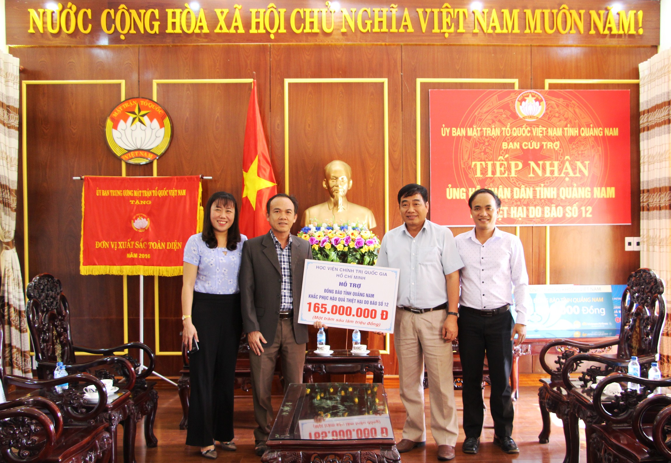 * Sáng ngày 30.11, Đại diện lãnh đạo Học viện Chính trị Quốc Gia Hồ Chí Minh do PGS.TS Nguyễn Ngọc Hòa - Phó Giám đốc Học viện Chính trị Quốc Gia Hồ Chí Minh đã đến thăm hỏi, chia sẻ đồng bào Quảng Nam bị thiệt hại do ảnh hưởng cơn bão số 12 vừa qua và trao ủng hộ số tiền 165 triệu đồng. Tiếp đoàn có ông Nguyễn Văn Long - Phó Chủ tịch Ủy ban MTTQ Việt Nam tỉnh.