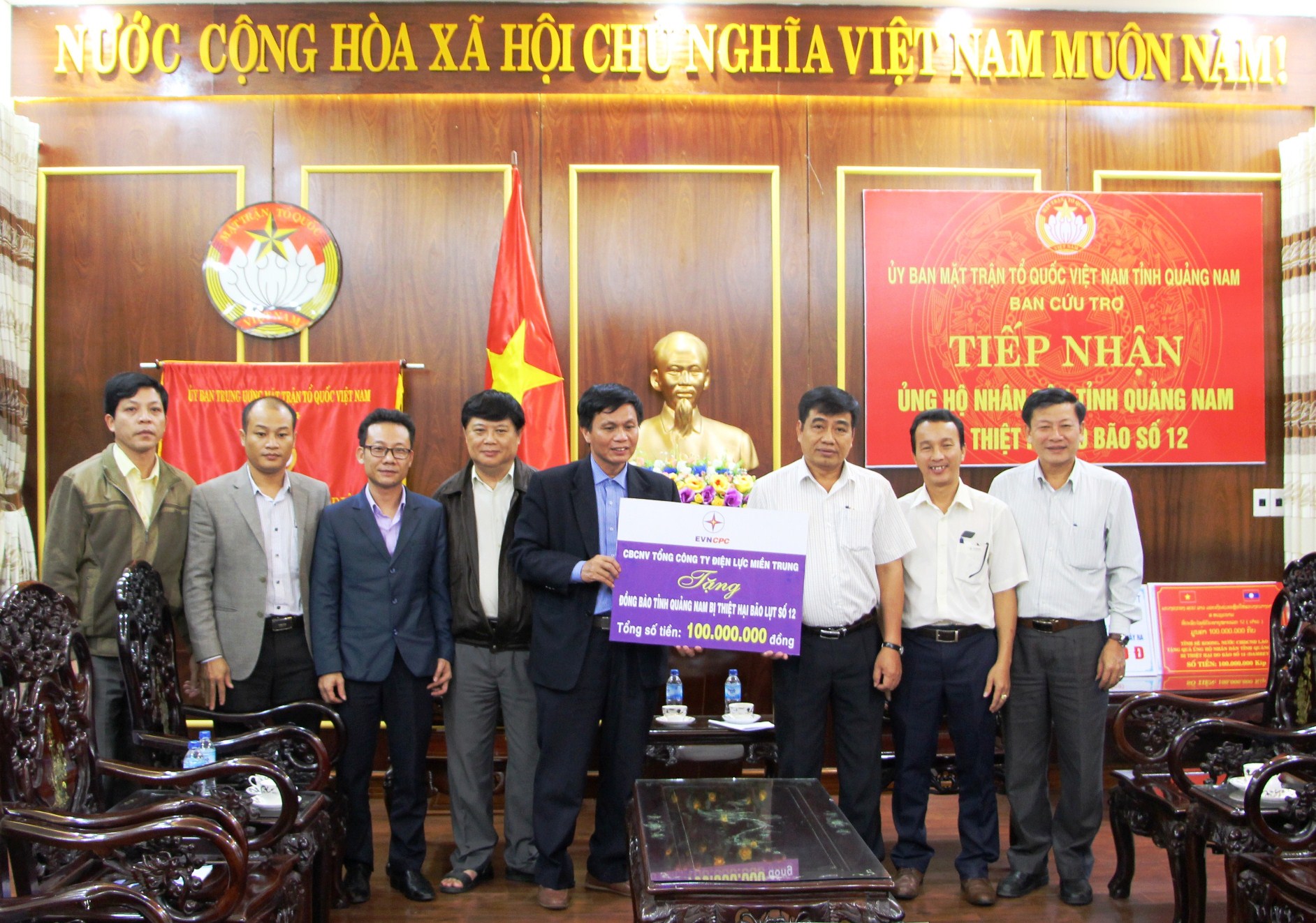 Chiều ngày 05/12/2017, ông Phạm Quốc Khánh- Chủ tịch công đoàn Tổng Công ty Điện lực Miền Trung đại diện cho lãnh đạo, CVCNV Tổng Công ty Điện lực Miền Trung đến thăm và trao số tiền 100 triệu đồng ủng hộ cho đồng bào Quảng Nam bị thiệt hại do ảnh hưởng cơn bão số 12.