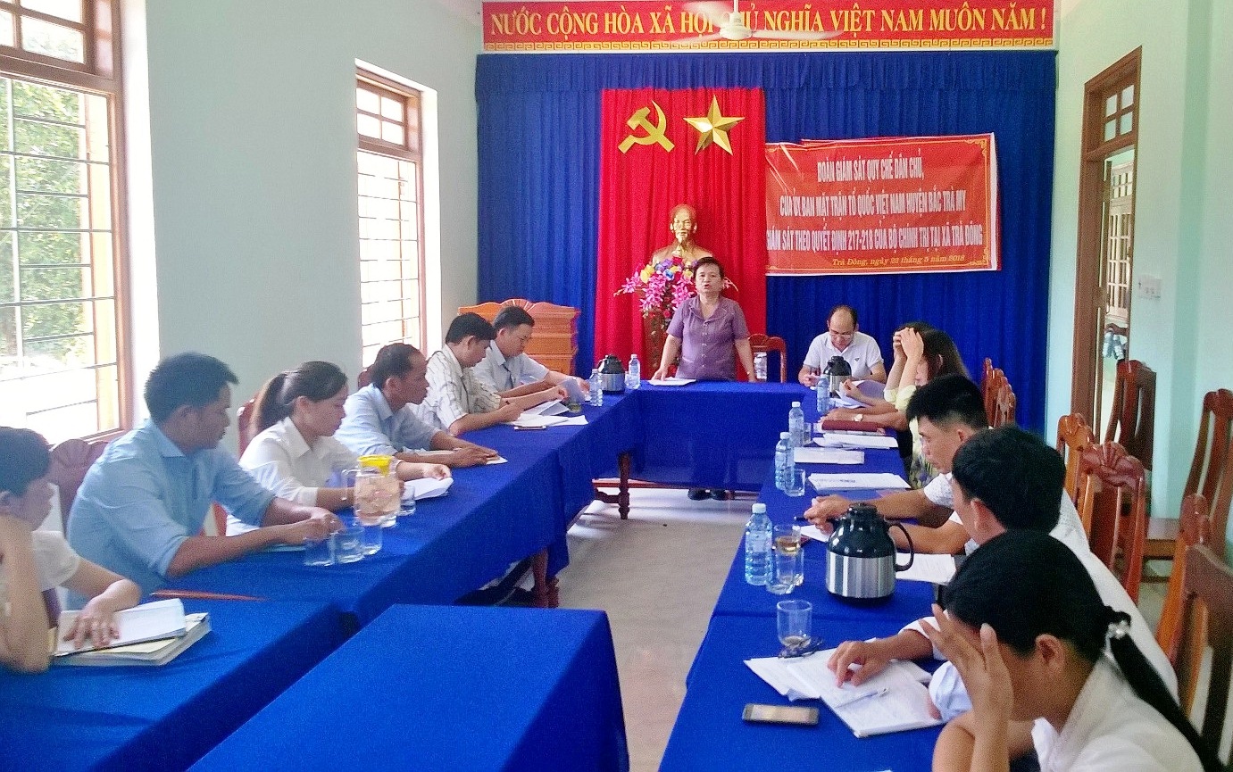 Ngày 22.5, tại UBND xã Trà Đông, Đoàn giám sát của Ủy ban MTTQ Việt Nam huyện Bắc Trà My do bà Nguyễn Thị Minh Lành - UVBTV Huyện ủy, Chủ tịch Uỷ ban MTTQ Việt Nam huyện, Trưởng ban Chỉ đạo thực hiện Quyết định 217, 218 -QĐ/TW của Bộ Chính trị làm Trưởng đoàn. Tham gia cùng Đoàn giám sát có đại diện lãnh đạo Mặt trận và các Hội, đoàn thể huyện; đại diện Phòng Tài chính-Kế hoạch, Phòng Nội vụ huyện.