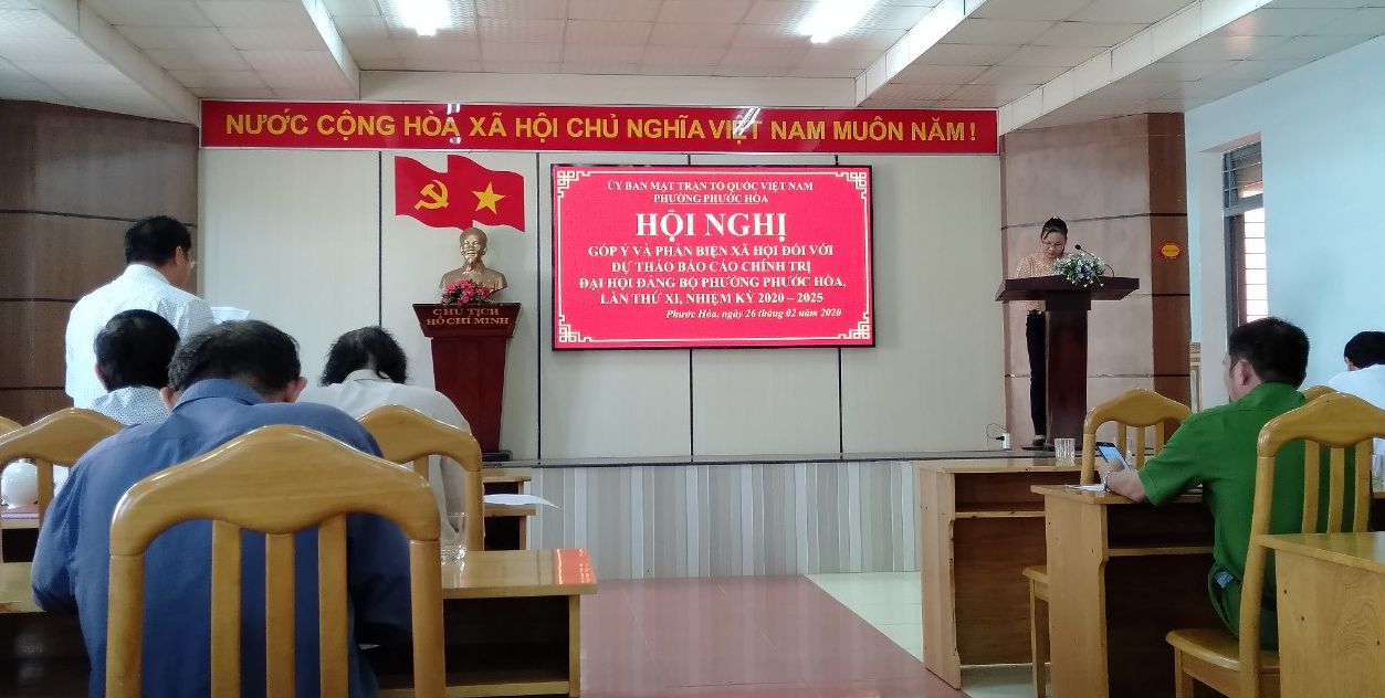 Chiều ngày 26/02, Ban Thường trực Ủy ban MTTQ Việt Nam phường Phước Hòa, thành phố Tam Kỳ đã tổ chức Hội nghị phản biện xã hội đối với dự thảo “Báo cáo chính trị Đại hội Đảng bộ phường Phước Hòa, lần thứ XI, nhiệm kỳ 2020-2025”. Bà Đặng Thị Ngọc Hà – UVBTV, Chủ tịch Ủy ban MTTQ Việt Nam phường, Chủ trì Hội nghị.