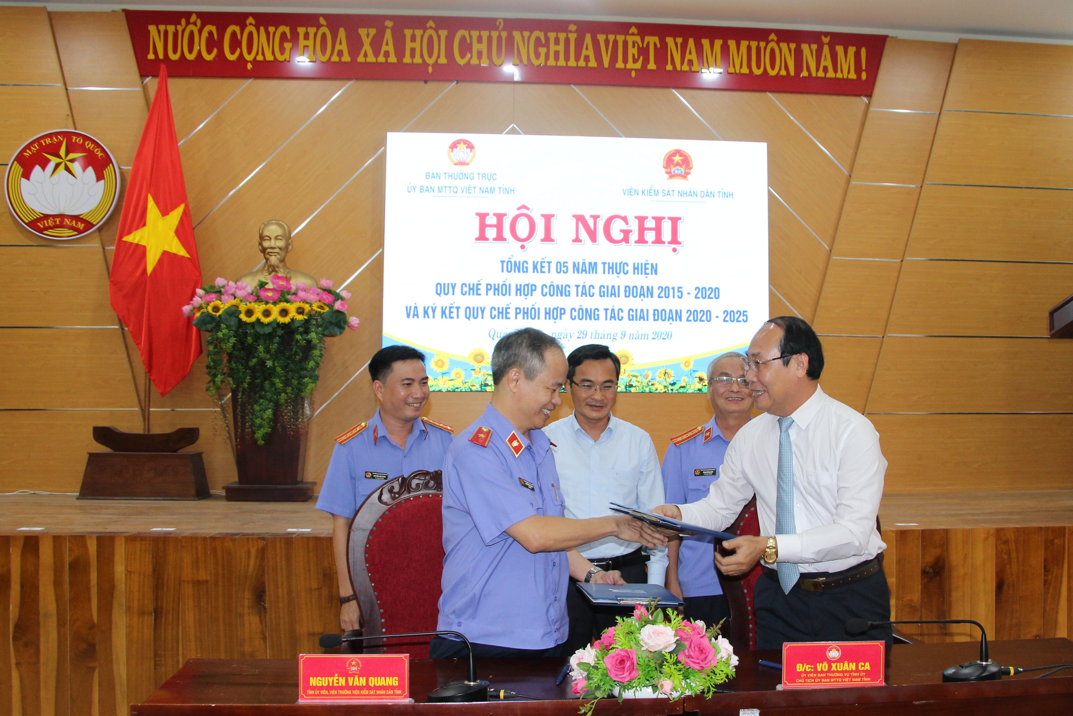 Chiều cùng ngày, Ban Thường trực Ủy ban MTTQ Việt Nam tỉnh tổ chức tổng kết 05 năm thực hiện Quy chế phối hợp giữa Ban Thường trực Ủy ban MTTQ Việt Nam tỉnh với VKSND tỉnh giai đoạn 2015-2020, ký kết Quy chế phối hợp giai đoạn 2020-2025. Tại hội nghị đã biểu dương khen thưởng cho 08 tập thể có thành tích xuất sắc trong việc triển khai thực hiện Quy chế.