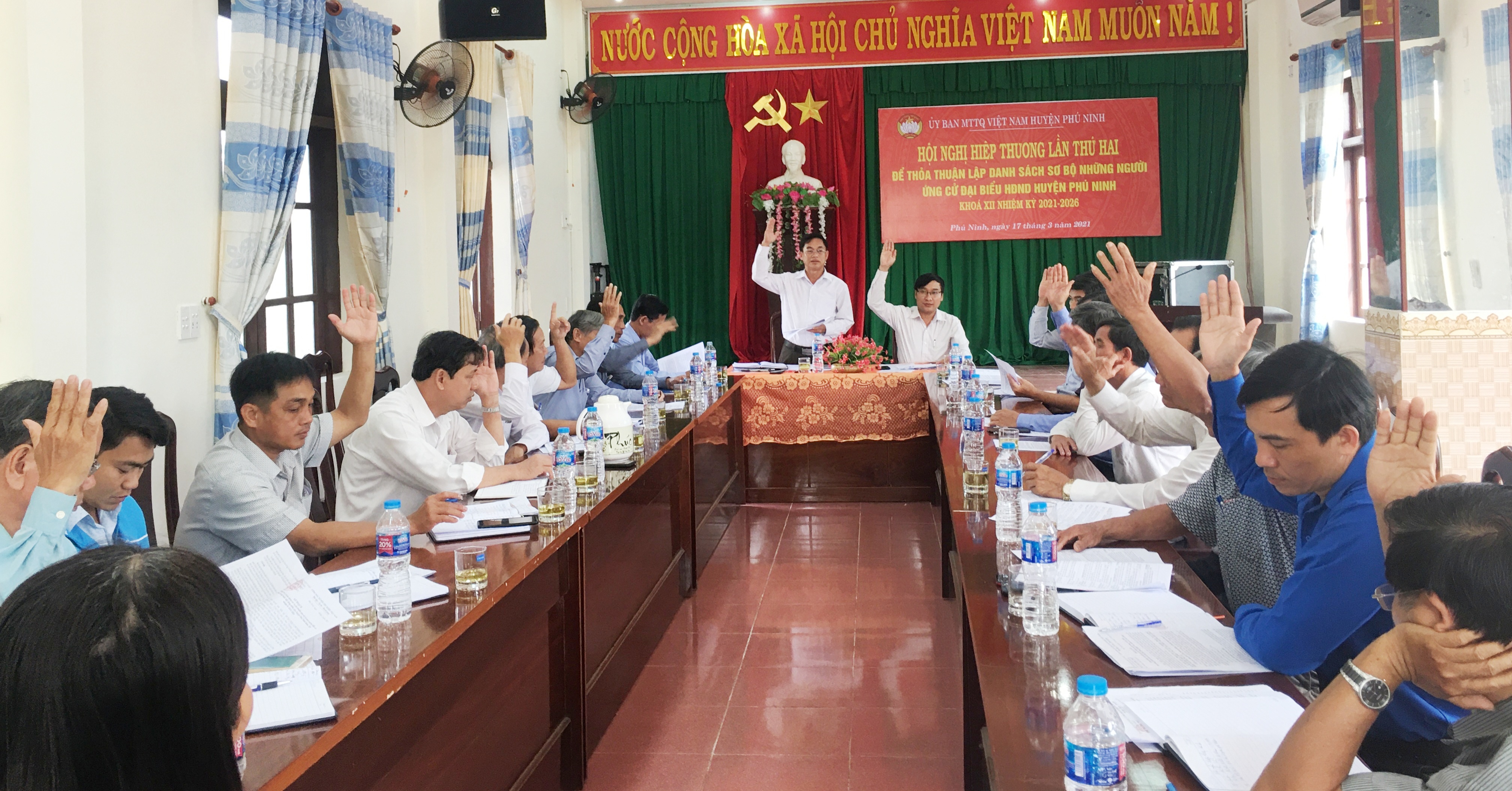 Hội nghị đã thỏa thuận và biểu quyết bằng hình thức giơ tay, 100% đại biểu có mặt thống nhất lập danh sách sơ bộ những người ứng cử đại biểu HĐND huyện khóa XII, nhiệm kỳ 2021-2026 gồm 60 người (trong đó có 01 người tự ứng cử).