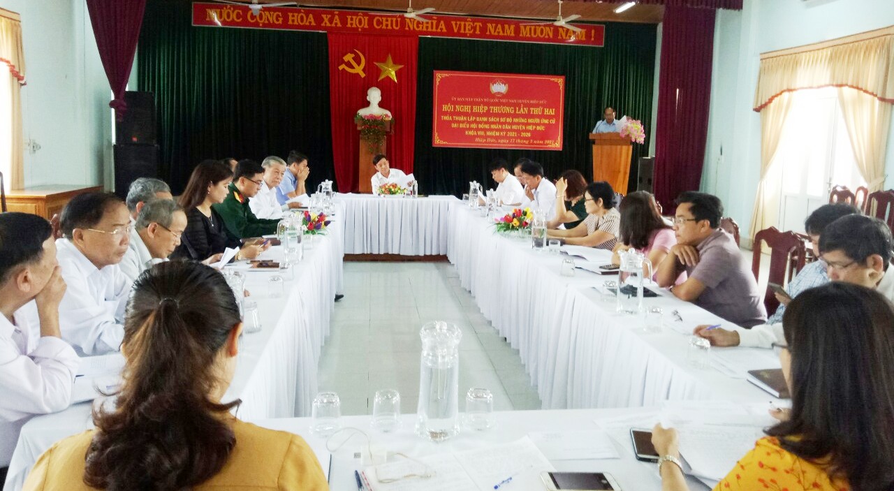 Hội nghị nghe báo cáo và kết quả việc giới thiệu người ứng cử đại biểu HĐND huyện khóa XII của các cơ quan, tổ chức, đơn vị; thông qua danh sách người được giới thiệu ứng cử (người tự ứng cử) đại biểu HĐND huyện. Theo đó, trên cơ sở hiệp thương lần nhất, sau khi xem xét, kiểm tra hồ sơ và tổng hợp ý kiến của các cơ quan, tổ chức, đơn vị có người giới thiệu ra ứng cử, Ban Thường trực Ủy ban MTTQ huyện và đại biểu dự hội nghị thống nhất danh sách sơ bộ 60 người ứng cử đại biểu HĐND huyện.