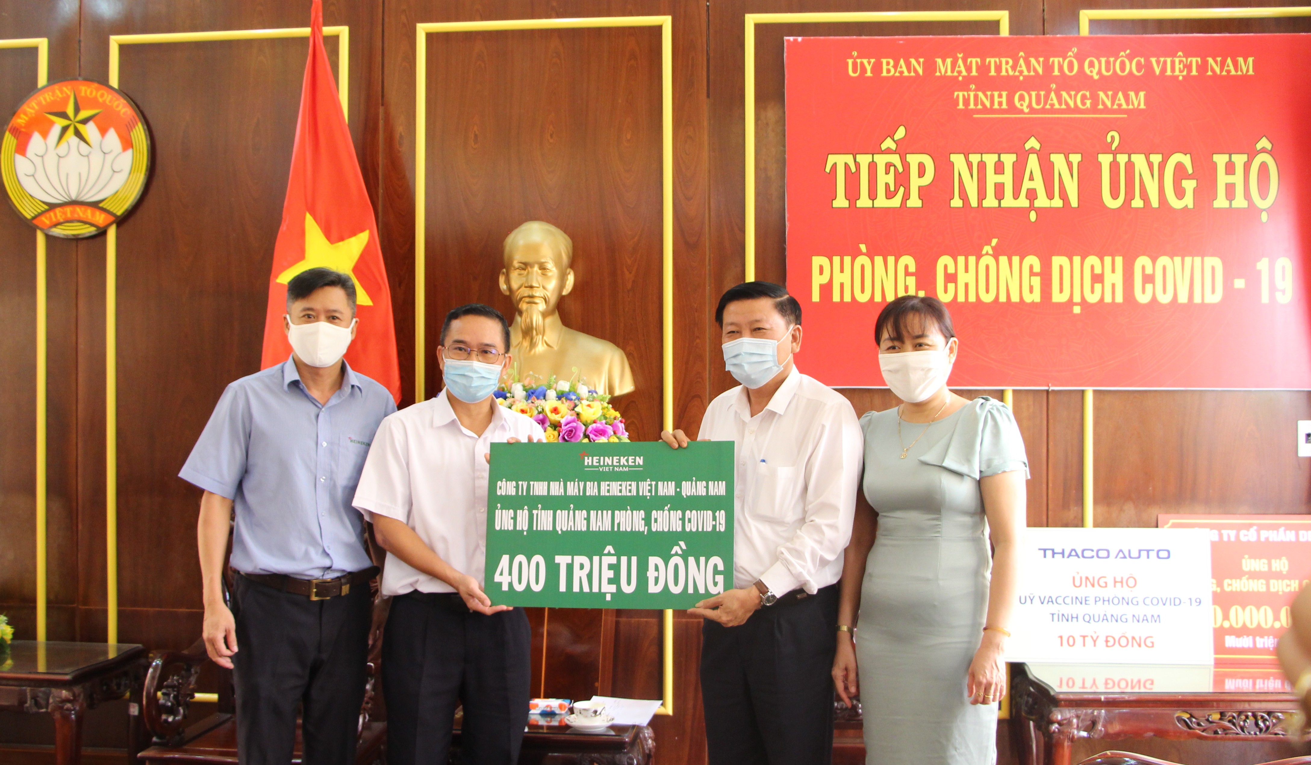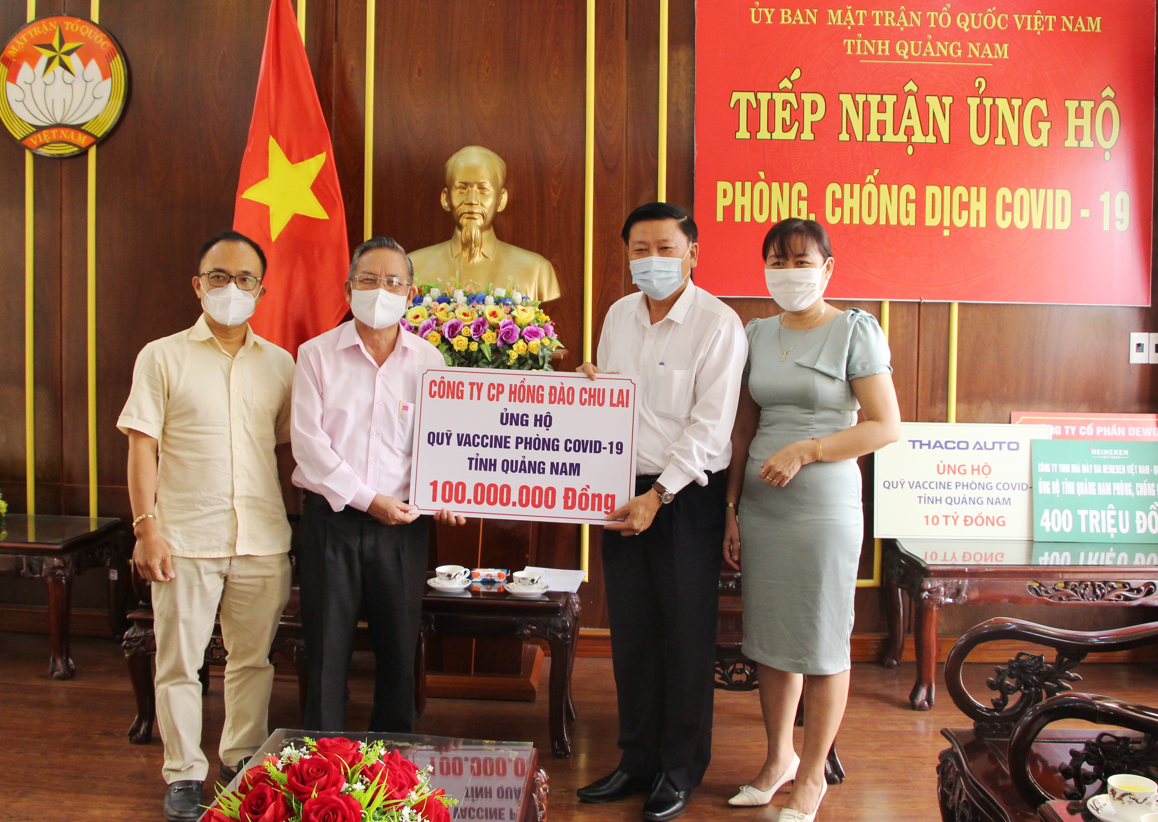 * Sáng ngày 10/6/2021, Ban Thường trực Ủy ban MTTQ Việt Nam tỉnh đón tiếp Lãnh đạo Công ty TNHH Nhà máy Bia Heineken Việt Nam tại Quảng Nam đến ủng hộ 400 triệu đồng và Công ty Cổ phần Hồng Đào Chu Lai ủng hộ 100 triệu đồng. Các doanh nghiệp luôn mong muốn với sự đóng góp của toàn xã hội nói chung, các doanh nghiệp nói riêng sẽ góp phần cùng với Nhà nước tập trung cho công tác phòng, chống dịch, đặc biệt đóng góp vào Quỹ Vacxin phòng chống dịch Covid-19 để mọi người dân được tiếp cận vacxin đẩy lùi dịch bệnh.