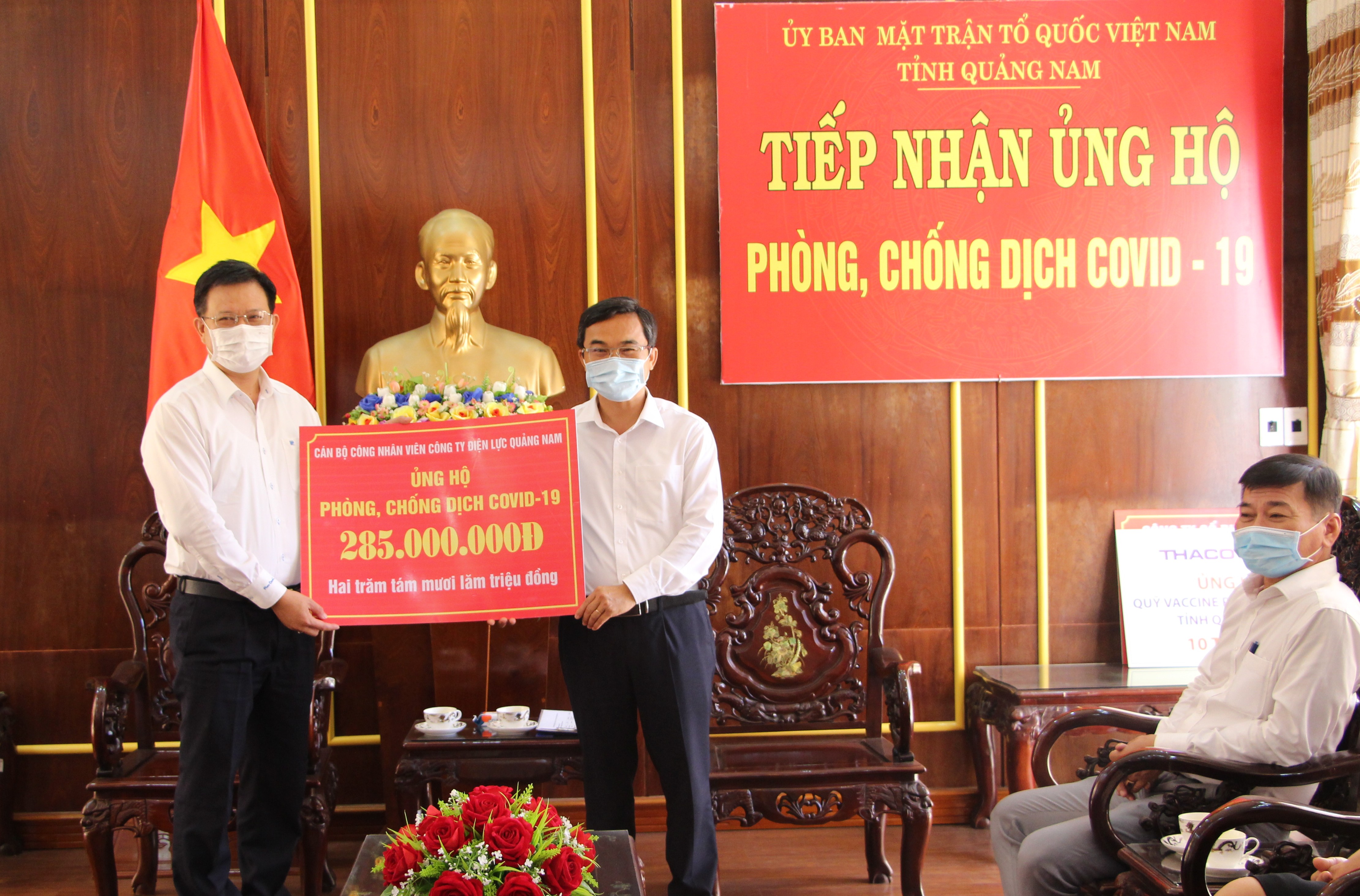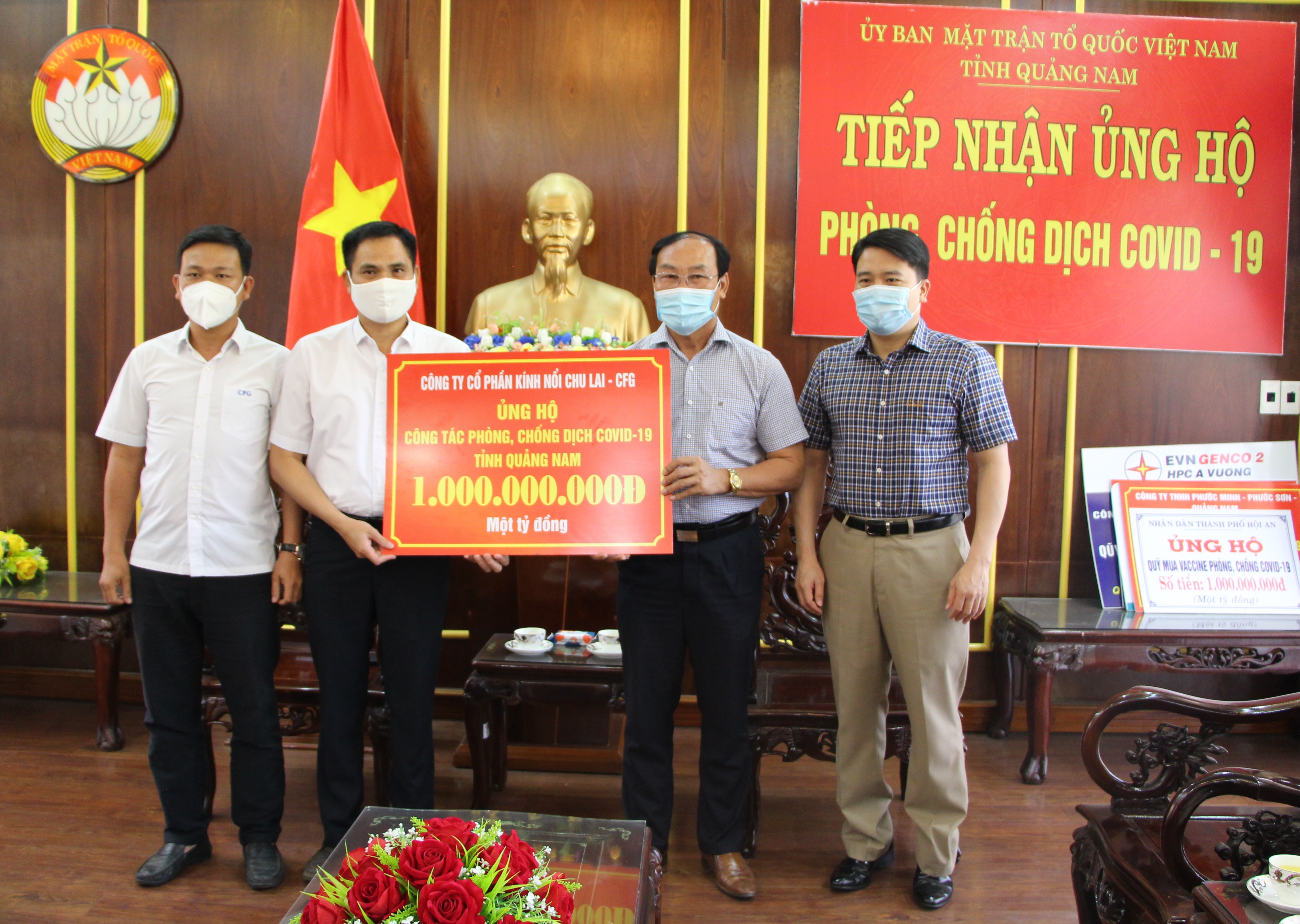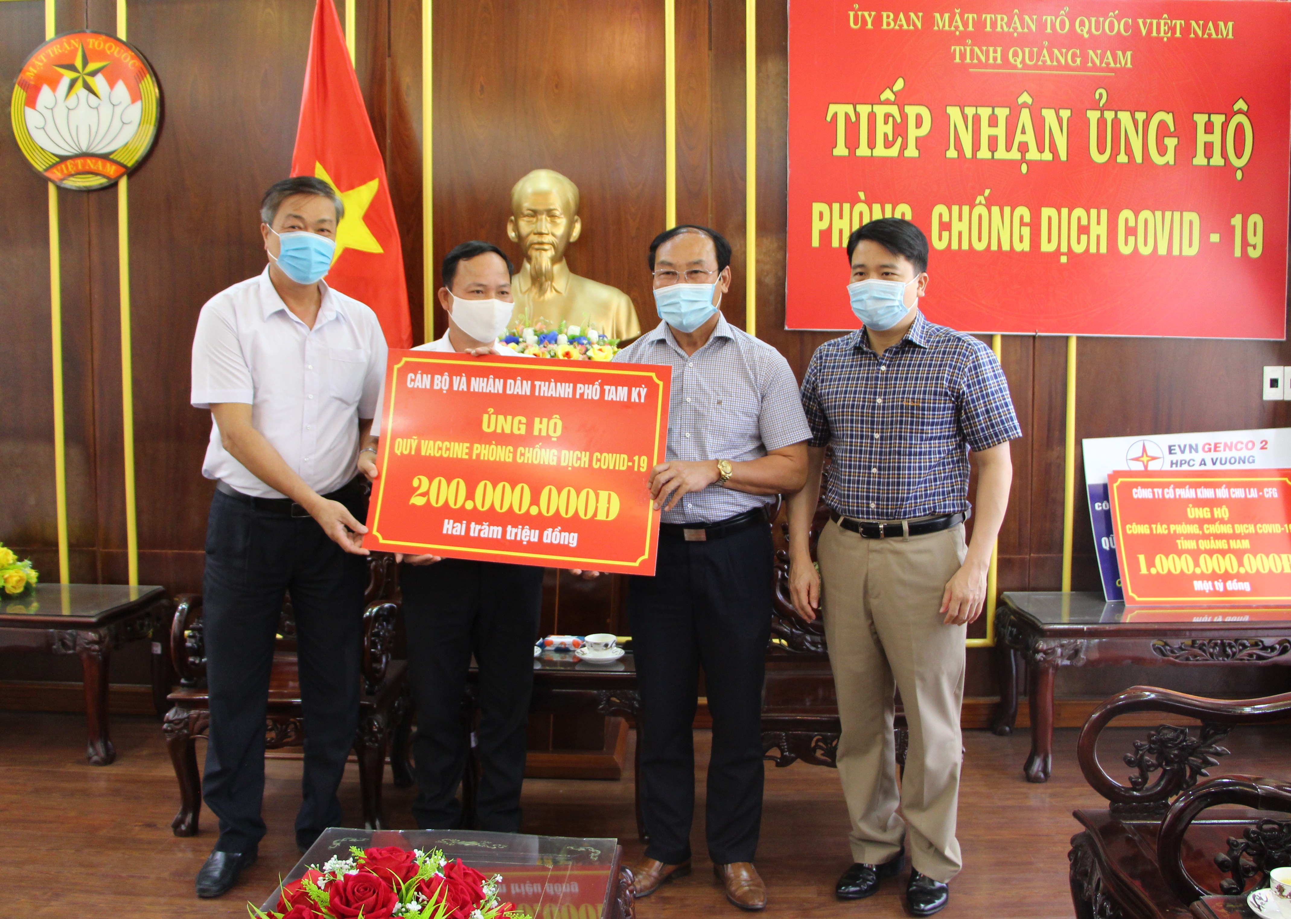 Chiều ngày 18/8/2021, ông Nguyễn Văn Dũng- Phó Tổng Giám đốc Công ty Cổ phần Kính nổi Chu Lai đại diện lãnh đạo, công nhân viên Tổng công ty đến trao số tiền 1 tỷ đồng ủng hộ Quỹ phòng, chống dịch bệnh Covid-19 tỉnh Quảng Nam và ông Dương Văn Chí- UVBTV, Chủ tịch Ủy ban MTTQ Việt Nam thành phố Tam Kỳ đại diện Nhân dân và cán bộ thành phố đến trao 200 triệu đồng ủng hộ Quỹ Vacxin phòng chống dịch Covid-19 . Ông Võ Xuân Ca- UVBTV, Chủ tịch Ủy ban MTTQ Việt Nam tỉnh và ông Trần Văn Tân- Phó Chủ tịch UBND tỉnh đón tiếp.